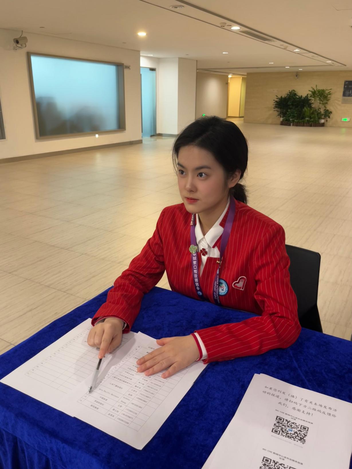我的岗位是新闻中心运营服务志愿者。作为进博会的“信息中枢”,课堂上所学的专业知识在这里具象化:每一个指引手势、每一次耐心解答、每一处设备保障,都是向中外媒体传递进博会组织水平与中国青年志愿者形象的重要符号。作为传院学子,能在此助力中国开放自信的形象传播,我倍感自豪。