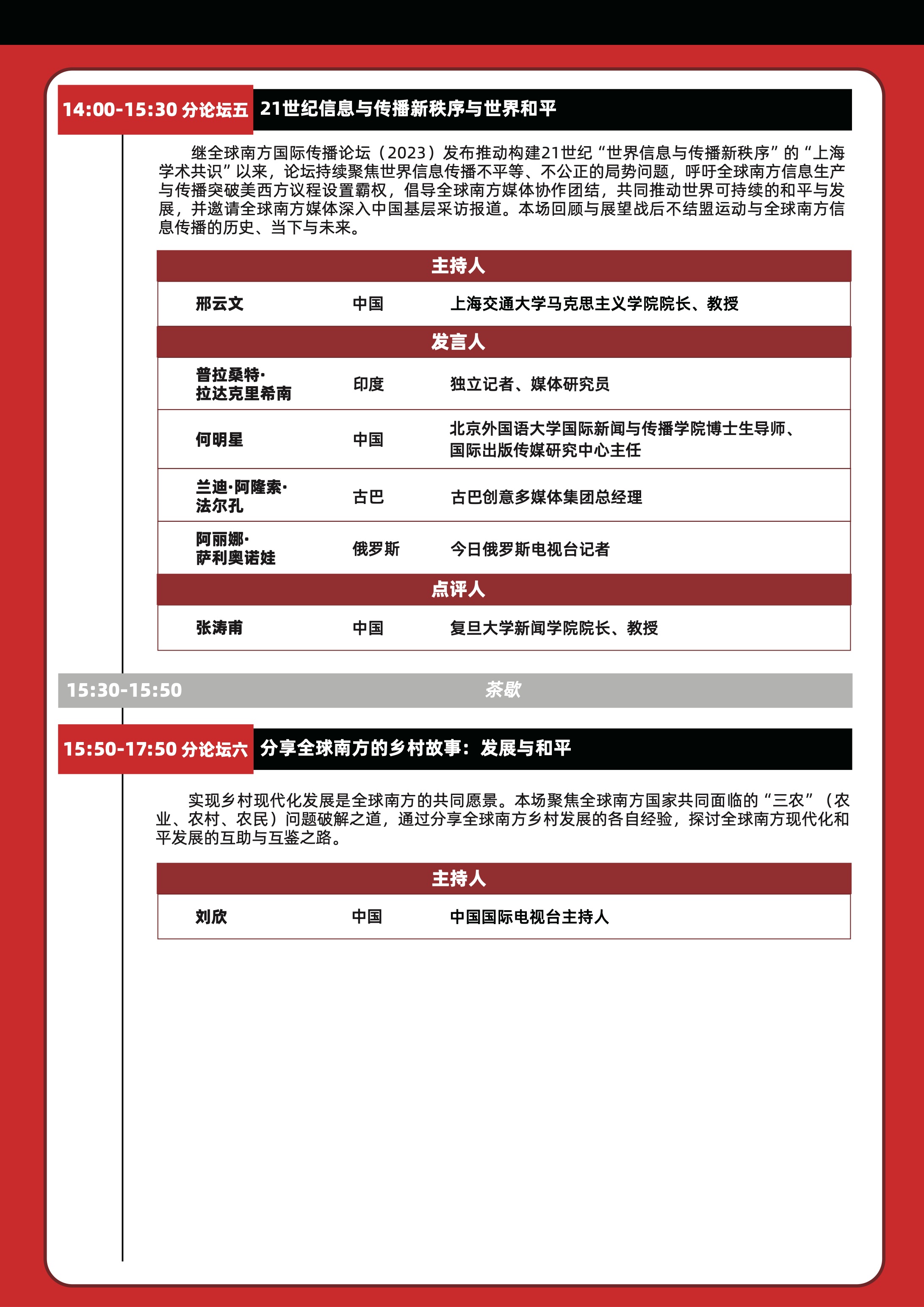 继全球南方国际传播论坛(2023)发布推动构建21世纪“世界信息与传播新秩序”的“上海学术共识”以来,论坛持续聚焦世界信息传播不平等、不公正的局势问题,呼吁全球南方信息生产与传播突破美西方议程设置霸权,倡导全球南方媒体协作团结,共同推动世界可持续的和平与发展,并邀请全球南方媒体深入中国基层采访报道。本场回顾与展望战后不结盟运动与全球南方信息传播的历史、当下与未来。