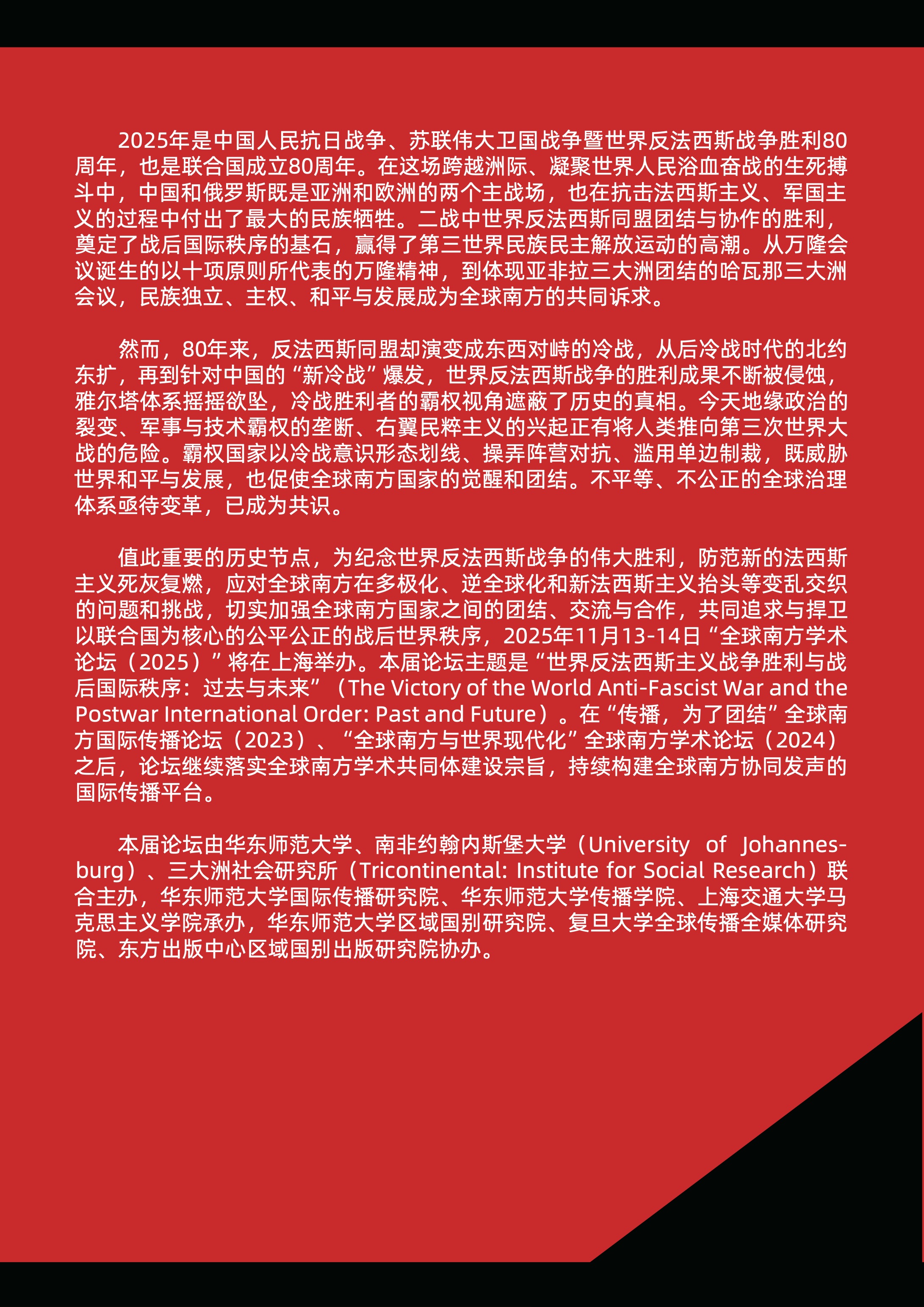 值此重要的历史节点,为纪念世界反法西斯战争的伟大胜利,防范新的法西斯主义死灰复燃,应对全球南方在多极化、逆全球化和新法西斯主义抬头等变乱交织的问题和挑战,切实加强全球南方国家之间的团结、交流与合作,共同追求与捍卫以联合国为核心的公平公正的战后世界秩序,2025年11月13-14日“全球南方学术论坛(2025)”将在上海举办。本届论坛主题是“世界反法西斯主义战争胜利与战后国际秩序:过去与未来”(The Victory of the World Anti-Fascist War and the Postwar International Order: Past and Future)。在“传播,为了团结”全球南方国际传播论坛(2023)、“全球南方与世界现代化”全球南方学术论坛(2024)之后,论坛继续落实全球南方学术共同体建设宗旨,持续构建全球南方协同发声的国际传播平台。