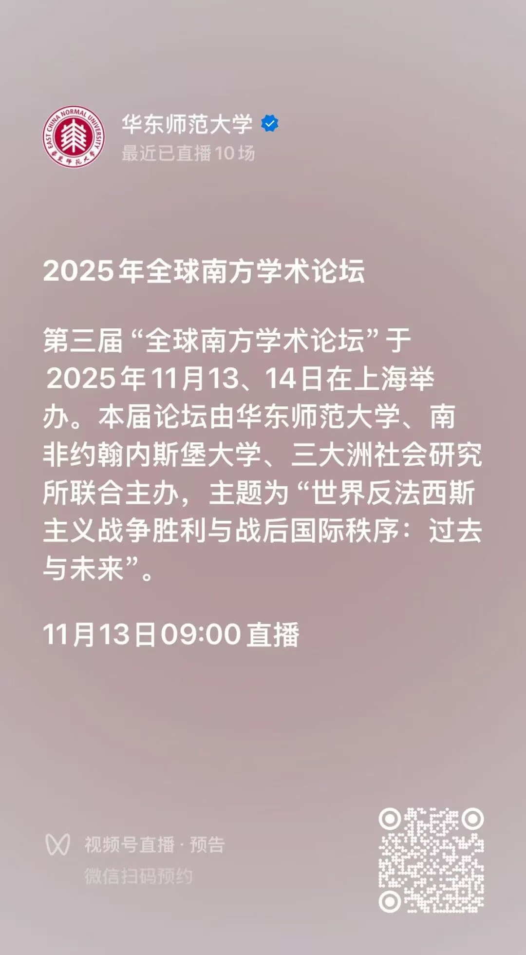 全球南方学术论坛(2025)于华东师范大学视频号、“看看新闻”APP、ShanghaiEye等平台同步直播,扫描二维码或点击“阅读原文”均可进入直播入口,敬请关注: