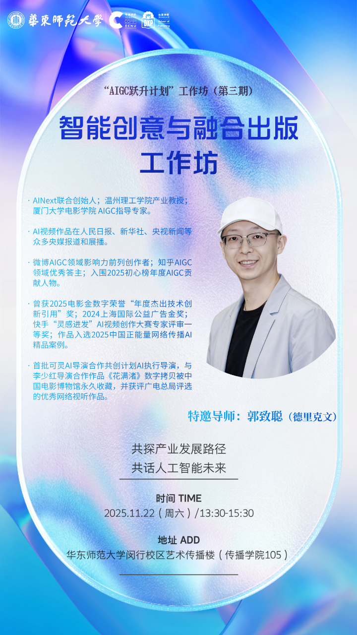 在以生成式人工智能为标志的技术跃迁持续推进之际,AIGC 正成为文化创意生产体系中最具变革力的关键变量。从内容生成、叙事结构到制作流程,智能化技术正不断重塑创意的边界。为推动学术思维与行业趋势的深度对接,“AIGC跃升计划”智能创意与融合出版工作坊(第三期)正式启动。本期工作坊在形式上延续“大师课”的框架,但在结构上进一步轻量与精炼,旨在为参与者提供更直接、更具启发性的学习体验。我们邀请来自数字艺术与智能创意领域的一线优秀创作者,以其真实的项目经验和长期的专业洞察,呈现 AIGC 在文化表达、视觉生成与内容传播中的前沿应用图景。