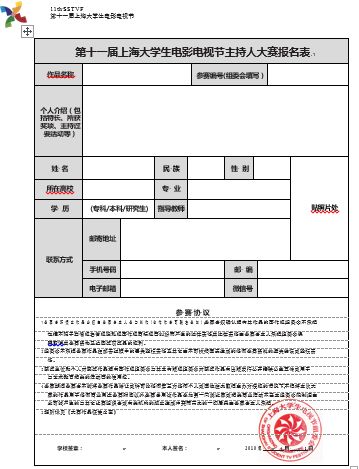 1、方式一:参赛者请见附页或登录上海大学生电视节官网下载报名表(复印有效)。请如实、完整填写表内各项内容,然后将电子版发到组委会指定电子邮箱(shdsjzcr123@126.com)。