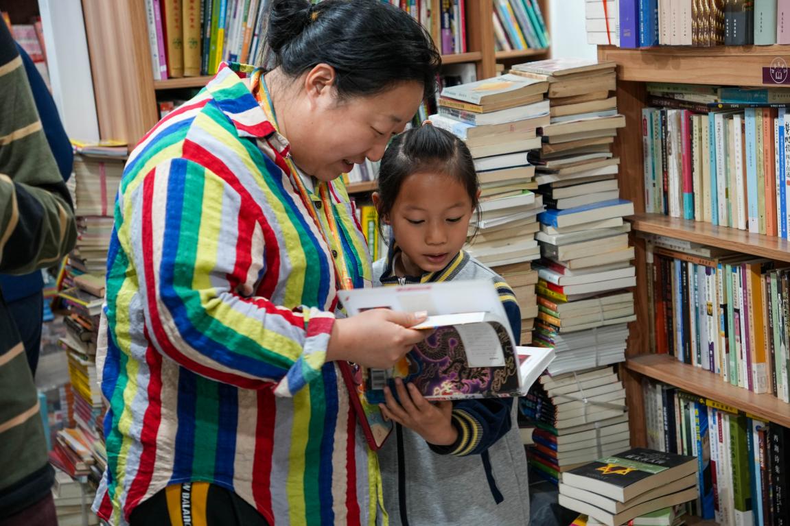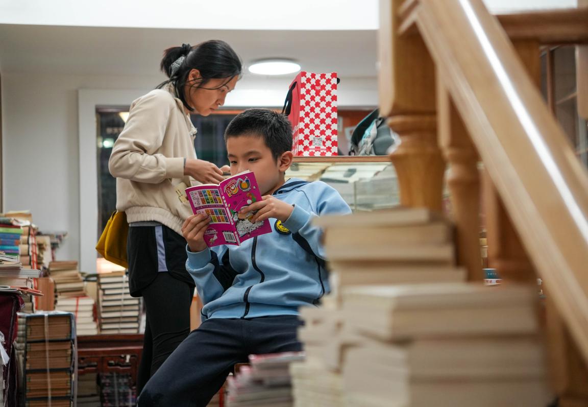 在店里逛的时候,我们看到了各种各样的“淘书姿势”:有学生踮着脚够上层的旧期刊,有妈妈带着孩子蹲在小桌前看连环画,还有位老先生伏在书架旁,手里拿着放大镜读一本1950年代的史书。