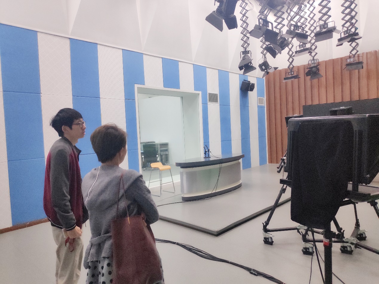 课堂的最后,舒老师和陈虹教授带领学生共同参观了学院新建设的融媒体中心和新闻演播室。在传播学院新落成的融媒体中心,舒老师表示需要把握这些新技术,让学生充分锻炼全面发展,与时代接轨,应对未来的智媒体挑战。