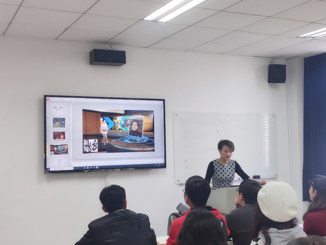 接着舒老师为同学们播放了一段介绍上海电视台新闻演播室“魔都之眼”的视频。这是全国首套新闻全自动直播系统,集大屏、虚拟、互动、多媒体聚合技术于一体,通过全自动一体化播控、摄像机虚拟场景跟踪以及一组既能各自拆分也能组合的交互触屏,将带来各种样式的新闻节目展现。舒老师解释说,这段视频不仅仅是让同学们了解“魔都之眼”的功能,更想让同学们清楚了解在一档直播节目中,需要看到的是不同工种之间的联合协作和默契配合。主持人是新闻报道接力赛里的最后一棒,是不可或缺的重要环节。
