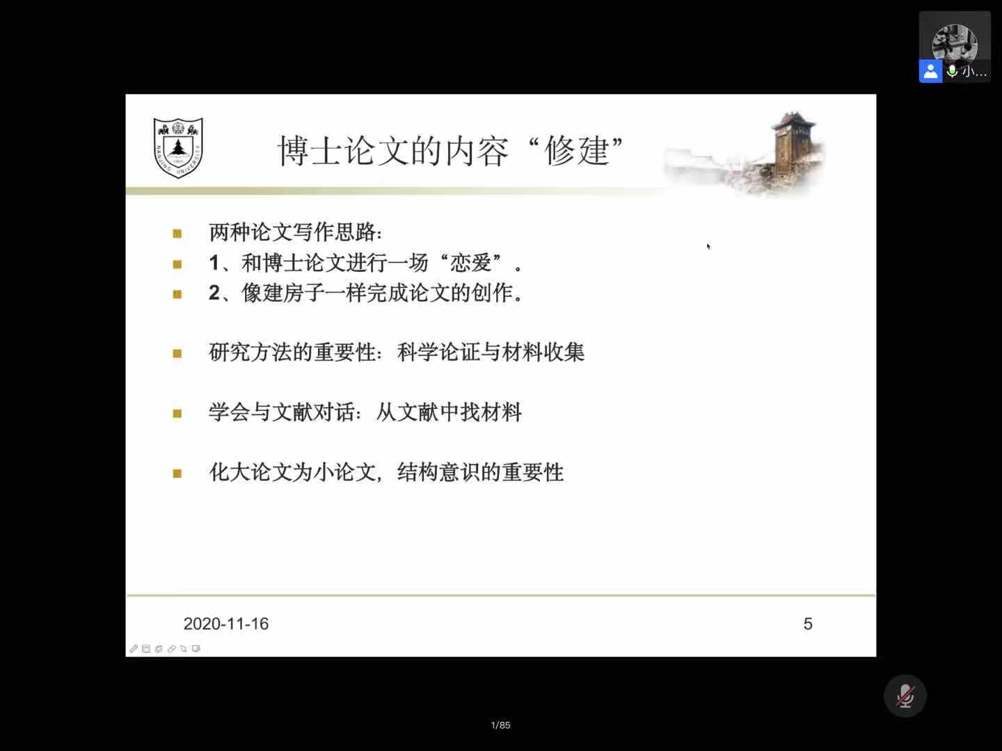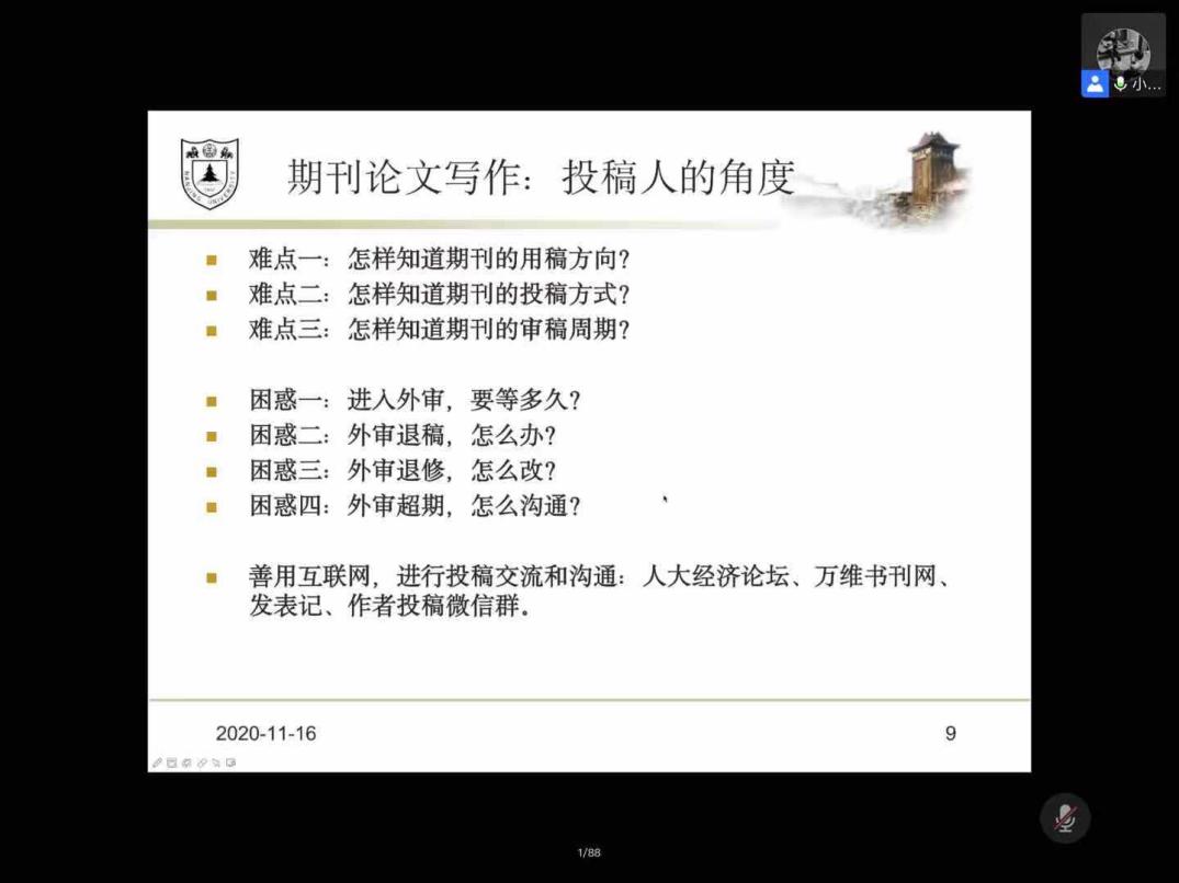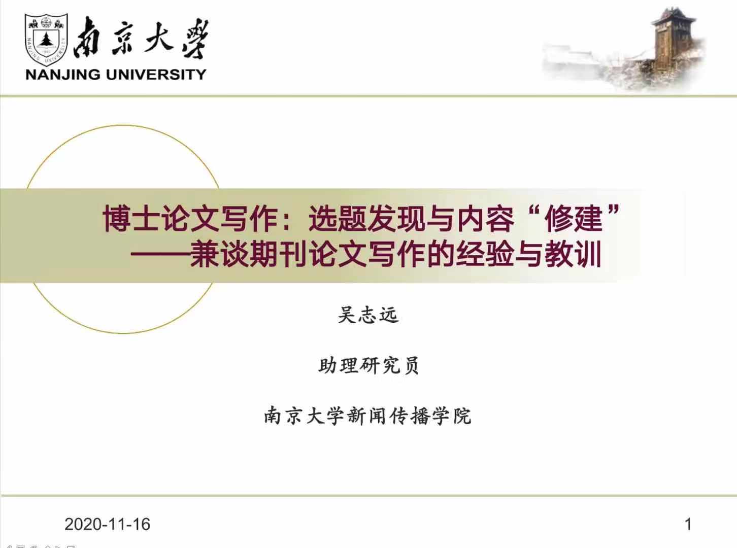 2020年11月16日下午,南京大学新闻传播学院助理研究员吴志远老师作了题为《博士论文写作:选题发现与内容“修建”——兼谈期刊论文写作的经验与教训》的学术讲座,结合自身读博期间的经历对博士论文的写作流程以及写作经验进行了分享。传播学院本次博思论坛通过腾讯会议进行全程直播,二百多名学生参与了线上讲座。