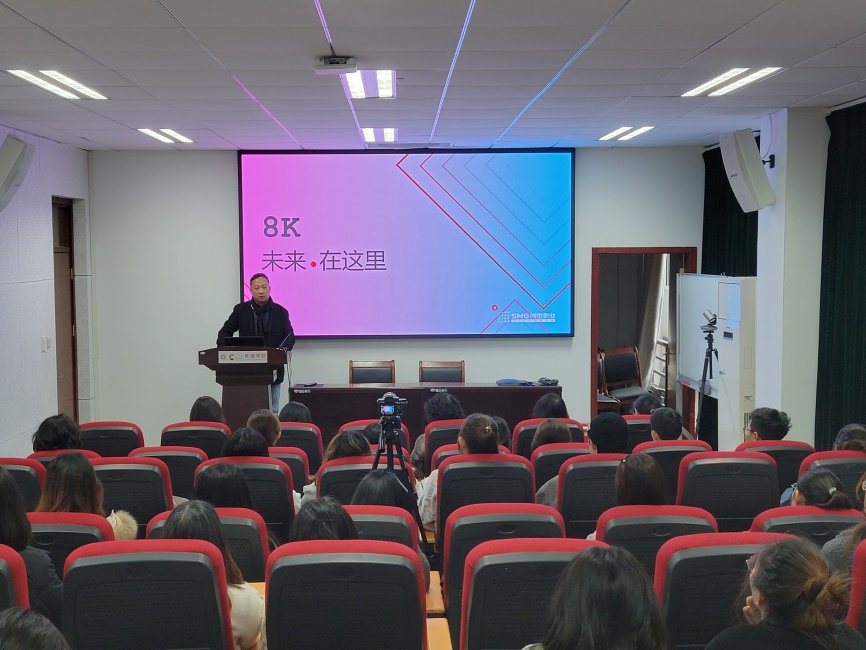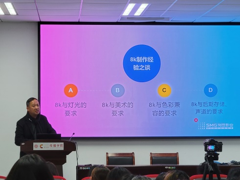 如果说鱼总以“务实”的核心内容站在同学们的角度来讲解,那么北京电影学院导演系毕业的资深导演崔轶则笑称自己从“务虚”的角度来让大家感受前沿科技。5G时代的到来,令中国的影视产业进行了不断地升级,崔导深度剖析了全球最前沿的8K技术在影视剧中的应用。崔导首先以两部好莱坞大片开启了8K技术话题,随后详细介绍了8K的概念和制作的全流程,以及该技术如何捕捉到人类肉眼看不到的精美画面。作为全国首部8K全流程制作的电视剧《两个人的上海》的制片人,崔导指出8K制作要与灯光、美术、色彩兼容、后期存储声道相互配合才能最终呈现在荧屏上。在崔导深入浅出的讲解下,师生们对8K技术制作全流程,以及这一前沿技术的应用对当下影视行业融合发展的重要意义有了清晰的认识。
