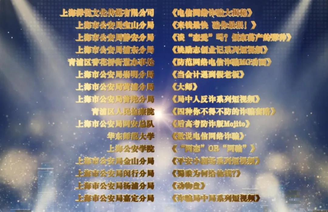 此次活动受到全社会的广泛关注和参与,通过快手专题活动页面及组委会邮箱投稿的视频达1100余部,点击量达4.3亿。经专家评审等环节,最终华东师范大学传播学院同学参赛作品《数说电信网络诈骗:昼警夕惕方可休》荣获三等奖。此次获奖的视频还将在全市轨交站点、户外大屏、东方明珠移动电视等多平台投放后滚动播放,全市公安社区民警也将藉由获奖视频,开展入户反诈宣传。