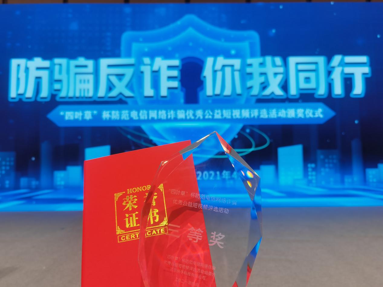 2021年4月14日下午,“四叶草”杯防范电信网络诈骗优秀公益短视频评选活动颁奖仪式在国家会展中心举行,华东师范大学传播学院学生团队作品《数说电信网络诈骗:昼警夕惕方可休》获得三等奖。