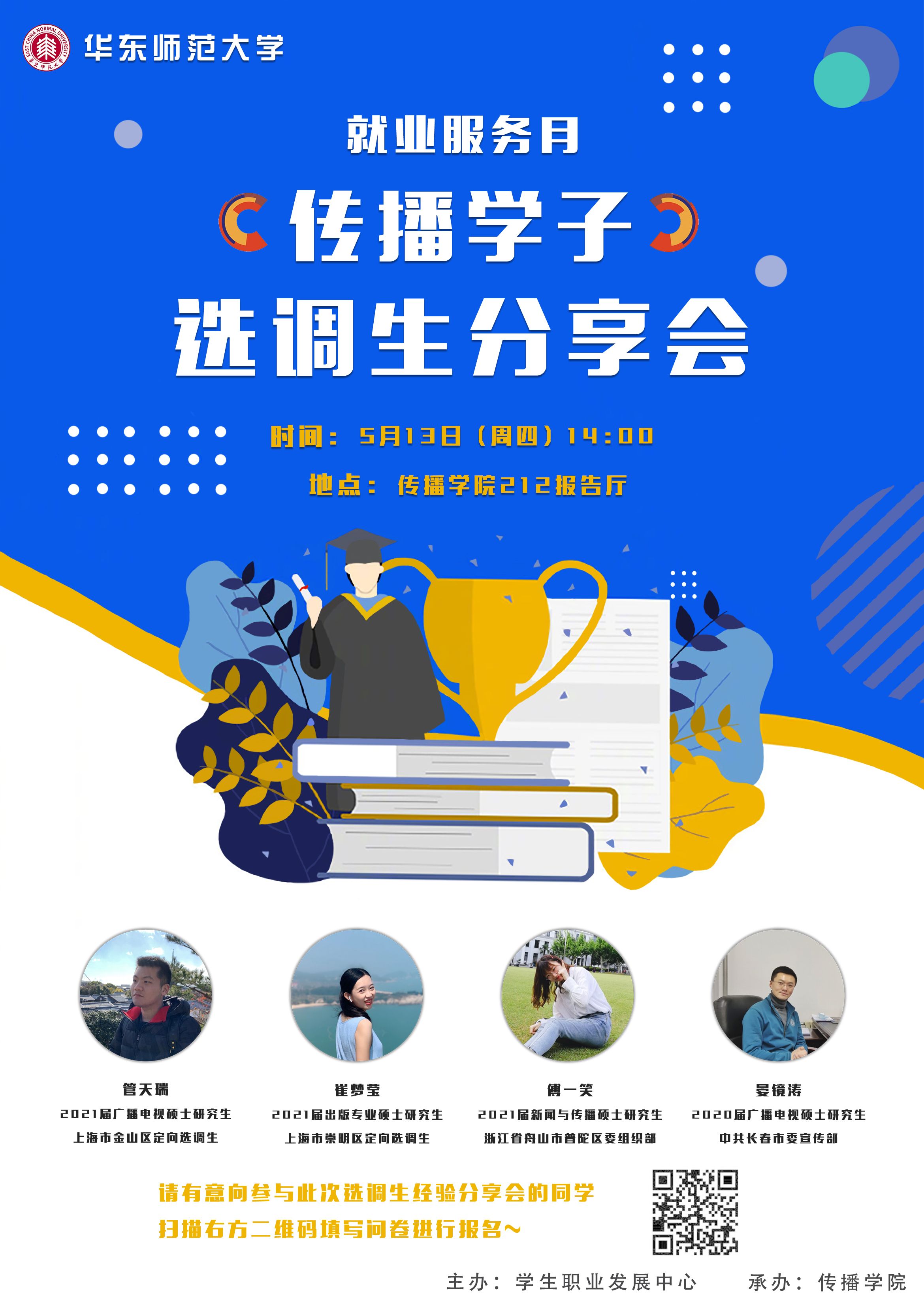 为了帮助解答同学们关于“选调生”的更多未知与疑虑,同时为有意向考取选调生的同学提供备考引导,传播学院将于2021年5月13日下午两点在传播学院楼212报告厅举办选调生专题经验分享会。本次分享会共邀请了四位成功考取选调生的优秀学长姐,他们将在此次分享会中为大家答疑解惑,分享成为选调生的心路历程、备考的相关经验等。