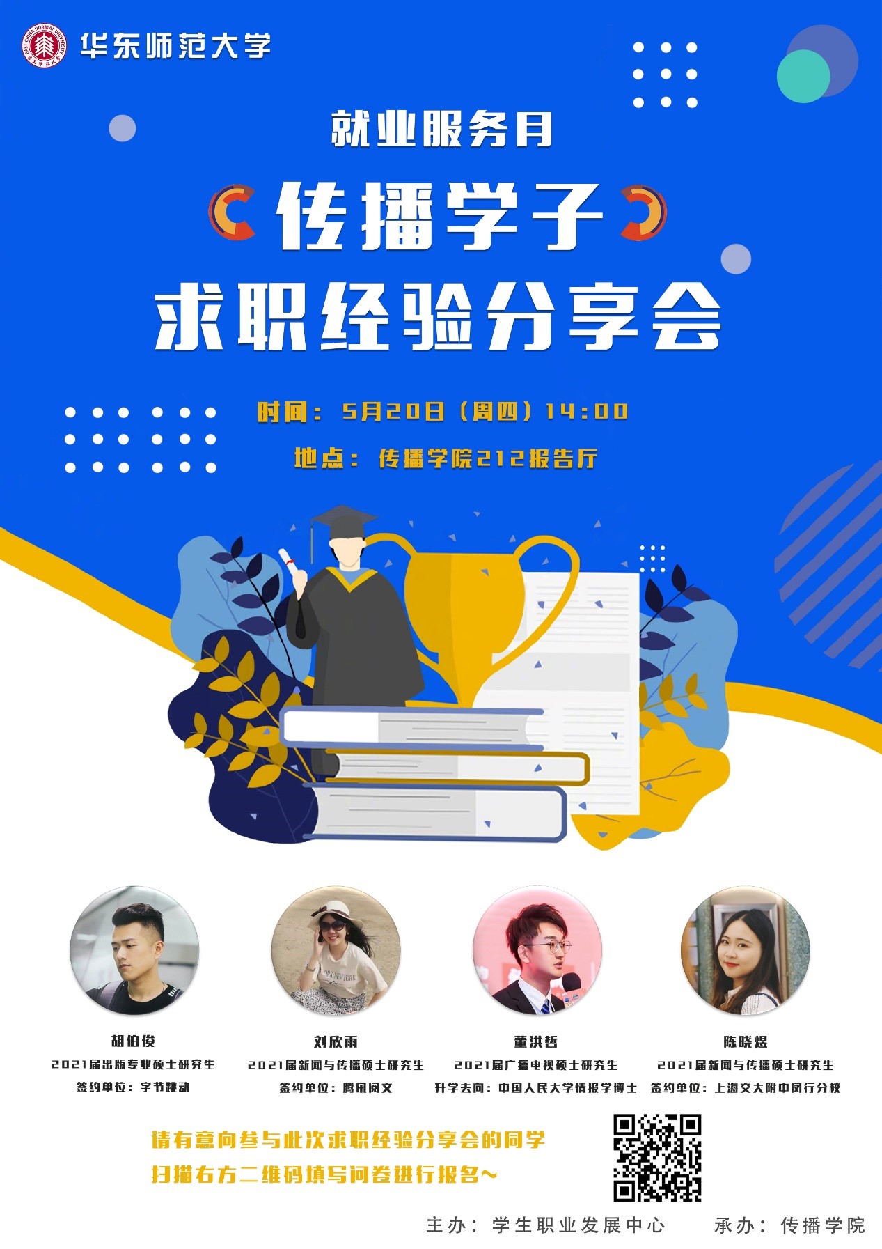 为了帮助解答同学们关于招聘求职的更多未知与疑虑,同时为有求职意向的同学提供引导,传播学院将于2021年5月20日下午14:00,在传播学院楼212报告厅举办求职经验分享会。本次分享会共邀请了四位有丰富求职招聘经验的优秀学长姐,他们将在此次分享会中为大家答疑解惑。
