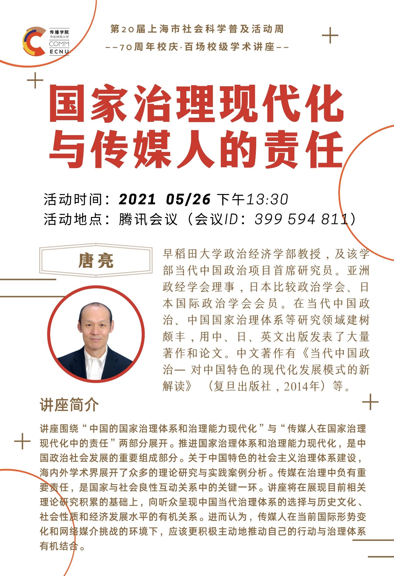 为庆祝建党100周年和华东师范大学建校70周年,进一步开阔我校师生学术视野,活跃学术气氛,打造学术品牌,学校设立了人文社会科学“70周年校庆·百场校级学术讲座”,作为第30场讲座的承办单位,传播学院特邀早稻田大学政治经济学部教授唐亮带来题为《国家治理现代化与传媒人的责任》的讲座。