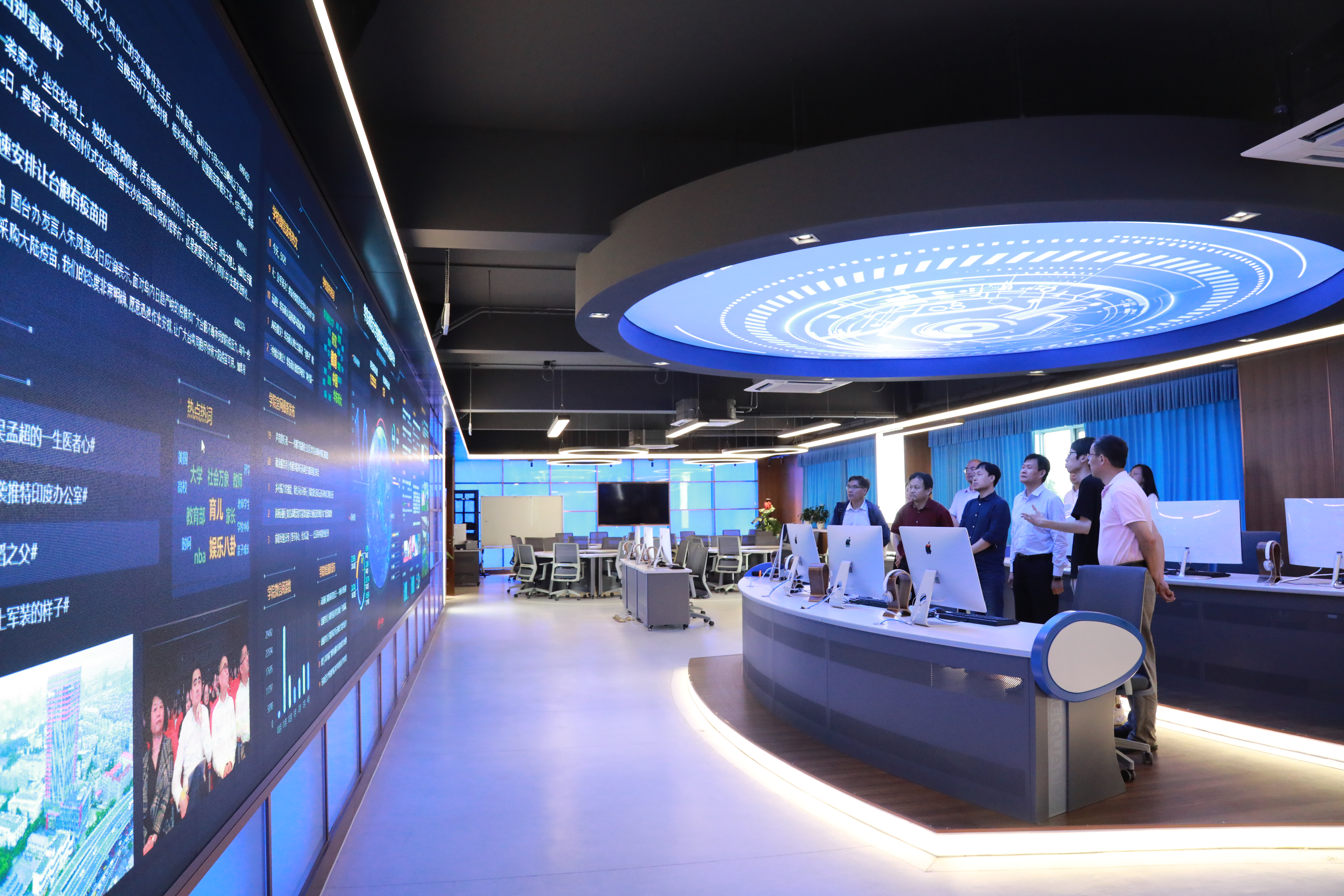 调研中,王秋亮一行参观了传播学院智慧与创意融媒体教学示范中心和学院其他实验室,融媒体中心主任徐正则为王秋亮一行进行了讲解和介绍。