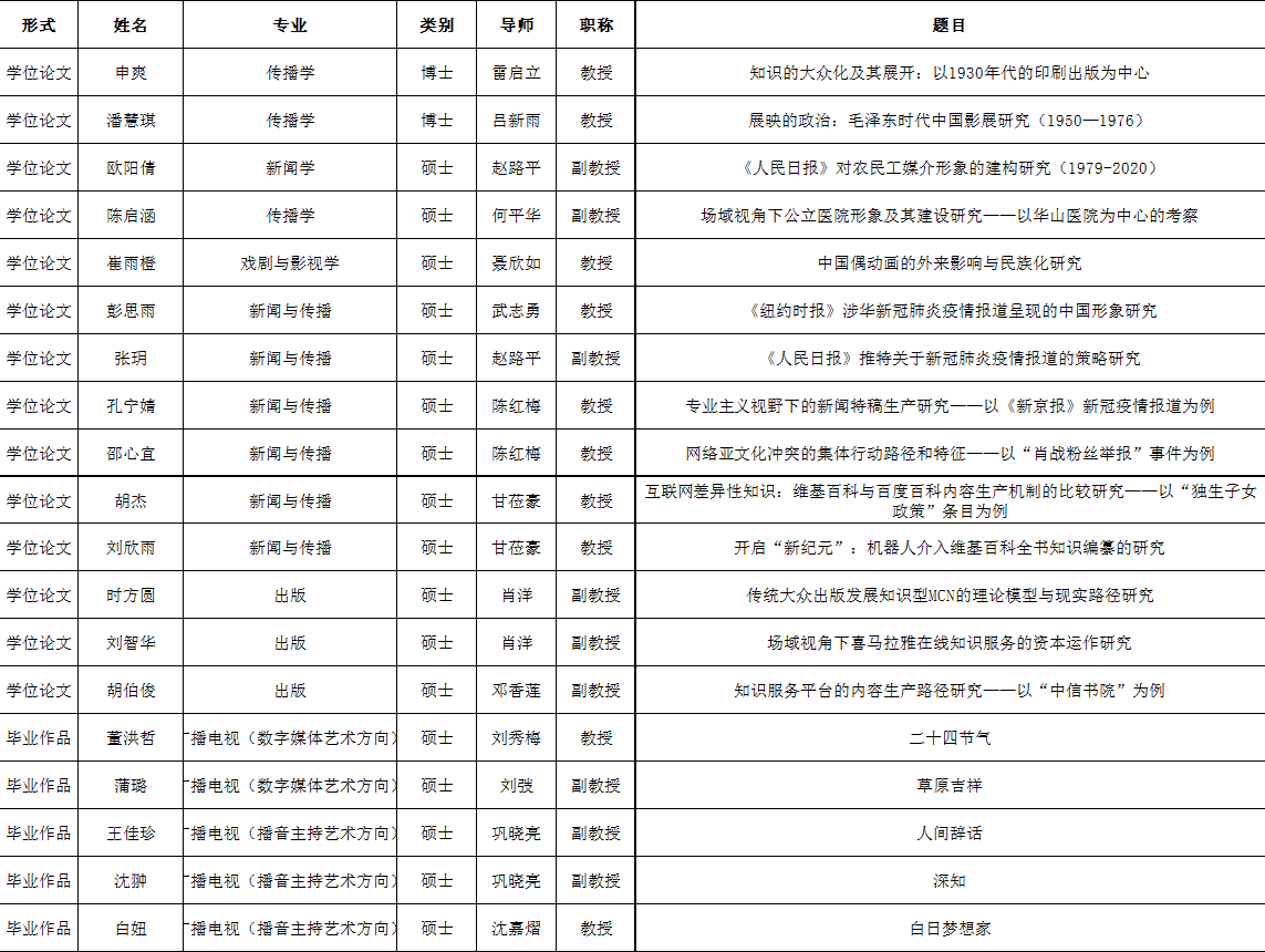 经各专业推选、新闻传播与戏剧影视分委会及各专业学位评定小组评议,并公示无异议,以下19篇学位论文或毕业作品获评为2021届华东师范大学传播学院研究生优秀学位论文、毕业作品。