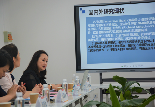 随后,项目主持人沈嘉熠教授从研究背景和目的、主要研究内容和创新点以及项目的研究进程等三方面向专家、学者汇报了项目的总体情况。她介绍,本次项目计划围绕“沉浸戏剧”、“戏剧事件”、“形式即主体”、“消费与观演”等关键词展开研究,通过关注、考察国内外多部沉浸式戏剧,归纳分类,总结适应中国当代社会文化的沉浸戏剧美学范式和特质及发展趋向。