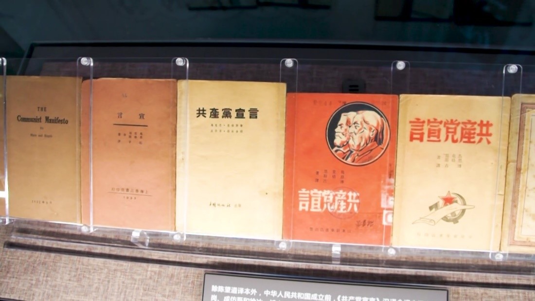 (一大会址纪念馆收藏的各版本《共产党宣言》)