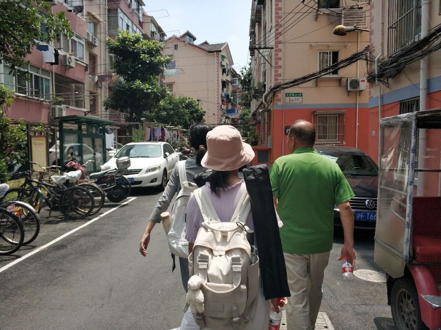 2021年6月12日,我们小组前往位于徐汇区的虹二小区,拍摄党员王忠芳的短片。刚见面时由于双方互不相识、比较陌生,王老师显得十分内敛和拘谨。彼此寒暄时,几位邻居先后经过,我们问起他们对于王忠芳老师的印象。上了年纪的老阿姨夸他忠厚;一起工作的同事评价他热心可靠,描述了有次他做志愿者时,将多买的早饭转赠给空腹前来打疫苗的陌生人垫肚子的故事;今年70多岁的前任楼组长老奶奶同样对他赞不绝口,还下意识地向王老师寻求帮助,称不会使用自己家中的空调遥控器,拜托他去看看,王老师一口答应。之后,王老师和我们解释说,老人家年龄大了,有些东西不敢用,所以有空就帮他们看看。他边说着,边向我们摆摆手,表示都是些小事情。拍摄途中,一对老夫妻恰好路过,妻子推着丈夫的轮椅,好奇地询问我们在做些什么,王老师走过去和他们熟络地交流起来、拉拉家常,自然而然地接过妻子手中的轮椅把手,推着走了一段路。