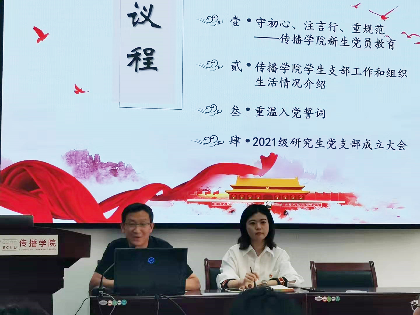 此后,大会进行了第三项议程,韩亚鲁同志带领全体党员重温入党誓词,并宣布传播学院2021级研究生第一、第二党支部正式成立。