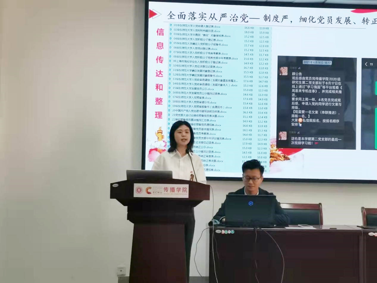随后,传播学院2020级研究生第一党支部书记韩亚鲁介绍了党支部组织生活与系列活动。包括:参观上海历史博物馆、助力进博会、“红色”手工模型搭建竞赛、“微党课”制作竞赛等“四史”、党史学习教育活动,让全体学生党员对日常的党组织生活有了更直观的了解。