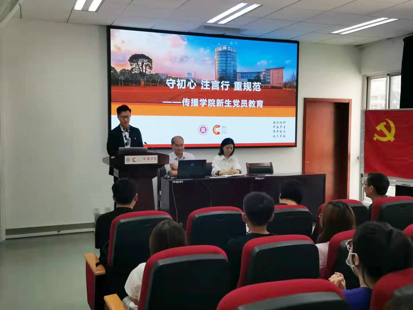 大会议程共四项,第一项是“守初心、注言行、重规范”——传播学院新生党员教育,由肖洋主讲,方奇华做重要补充。