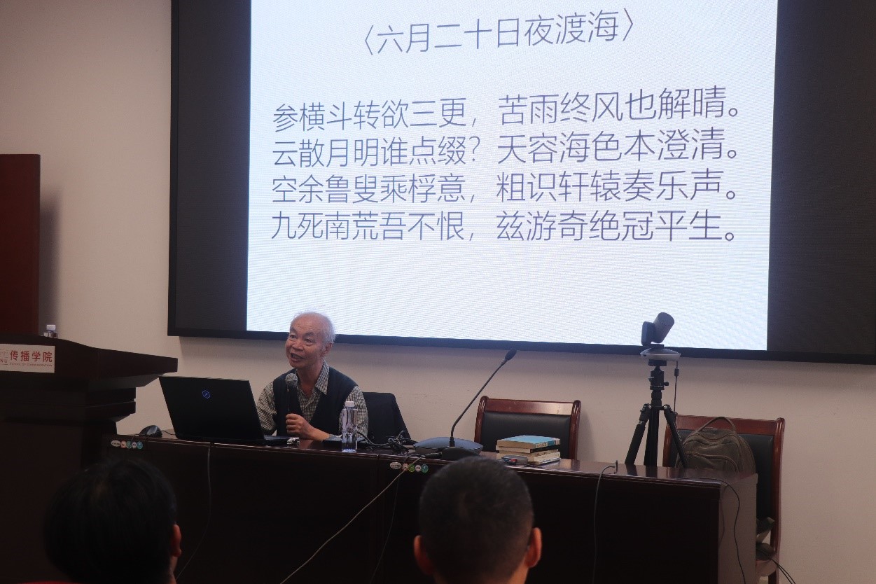 紧接着,吕正惠教授又将苏轼的生平同诗歌内容相结合,将苏轼卷入“乌台诗案”后屡遭贬斥,心境不断变化,终归豁达的过程娓娓道来,把台下师生也带入当时的情境之中,共同感悟苏轼的人生体验与情感流变。由此出发,吕正惠教授把苏轼诗词的特点,同时也是中国诗词的特色总结为三点,一是诗歌中重视大自然的恒常性,以自然之美触动人们的心灵;二是重视人间之情与人伦之情,以共通的情感唤起人们的共鸣;第三则是因为诗歌的普遍性,文字浅白却诗意隽永,使得一般人都容易理解、体会其中意涵,因此上至士大夫,下至平头百姓,都能够领略诗歌的美妙之处。这些特征也构成了中国古代诗词的传播特质。