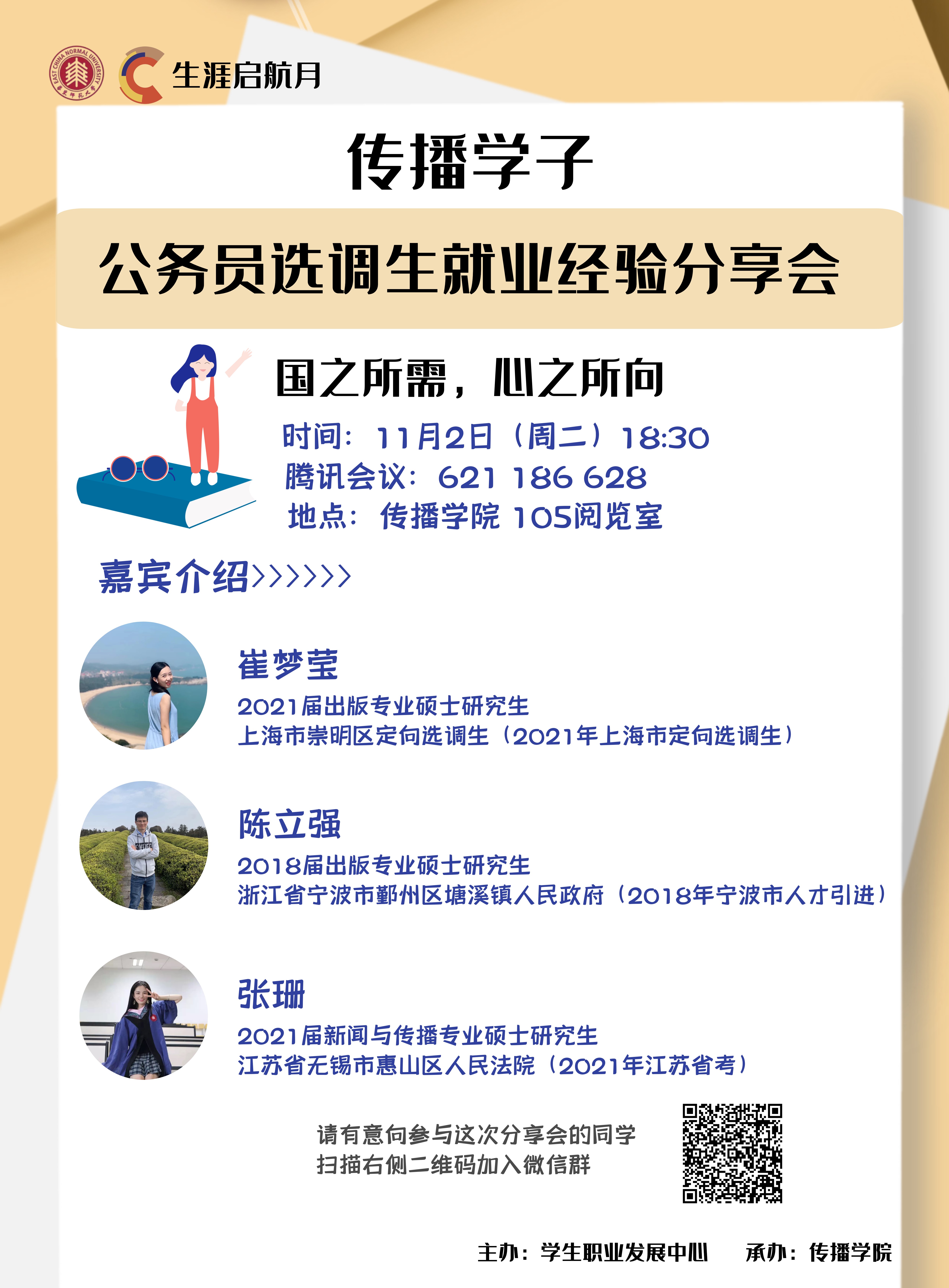 为了帮助同学们深入了解相关就业政策,解答同学们关于“公务员”和“选调生”的更多未知和疑虑。由就业发展中心主办,传播学院承办的“生涯启航月”活动——传播学子公务员选调生就业经验分享会,将于2021年11月2日18时30分在传播学院105阅览室举行。本次分享会共邀请了三位有成功经验的优秀学长学姐,他们将在此次线上分享会中为大家答疑解惑,分享自己的心路历程和备考的相关经验等。