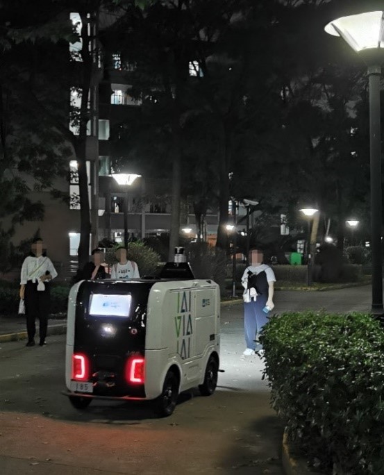 (图为在宿舍楼下停靠等待同学取件的无人车)