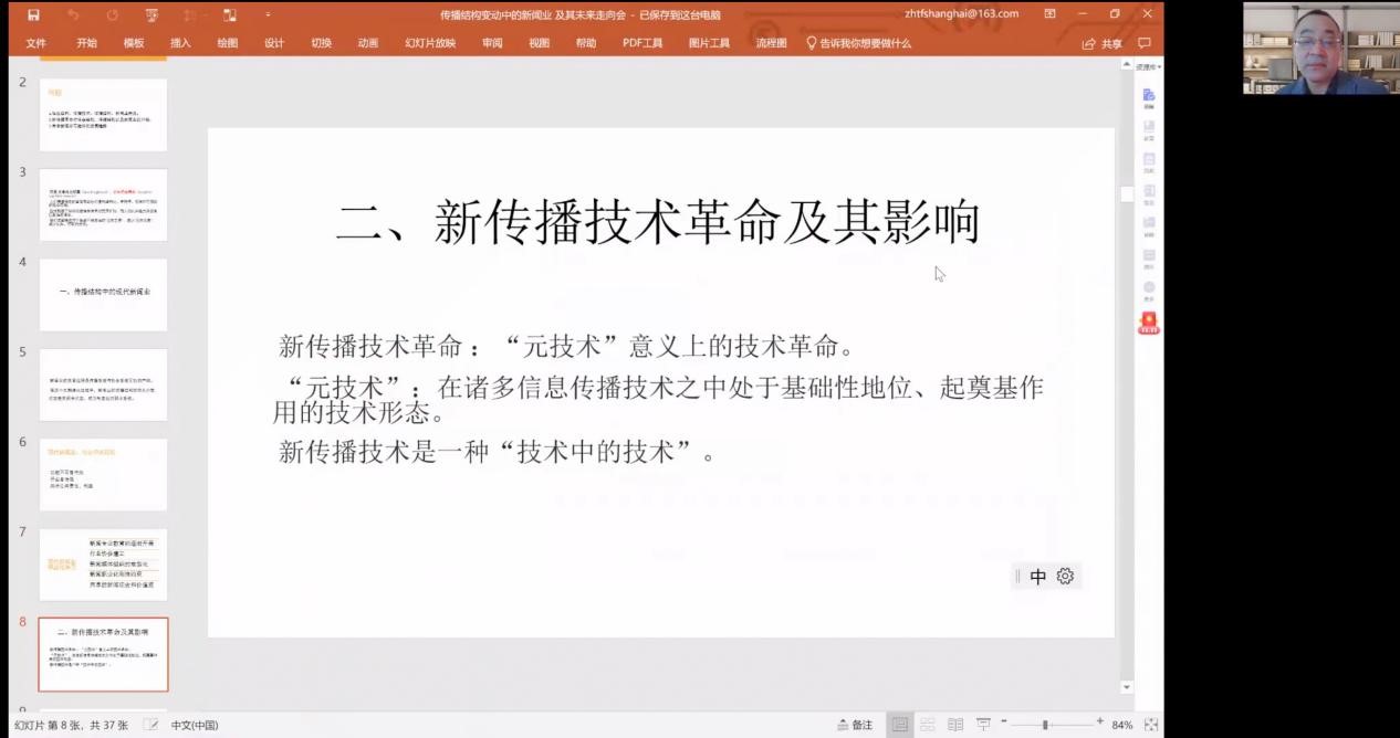 接着,张涛甫教授阐发了对新传播技术革命的认识。他认为,新传播技术革命是“元技术”意义上的技术革命,“元技术”是指在诸多信息传播技术之中处于基础性地位、起奠基作用的技术形态。新传播技术革命有五个显著的特点:一是去物质化,即克服传统交往空间对于实在性和物理空间性的依赖;二是数字化,诸如VR、AR等数字技术不再是模拟的技术,可以创造虚构的空间,更具有能动性和建构性;三是个体化和社会化,数字技术释放了人的个体活性,个体可以从社会关系网络中解脱出来,利用数字空间重新缔结新的社会关系;四是图像化和视频化,信息传播活动实现了从文字到图像的转变,社会、世界成为图像化的存在,新传播技术借助图像符号,建构了诸多拟现实的场景;五是复杂性,新传播技术赋予了人们建构复杂社会角色的可能,颠覆了传播社会语境下的关系结构,群体传播所蕴含的复杂性超越了传统社会科学理论的解释边界。