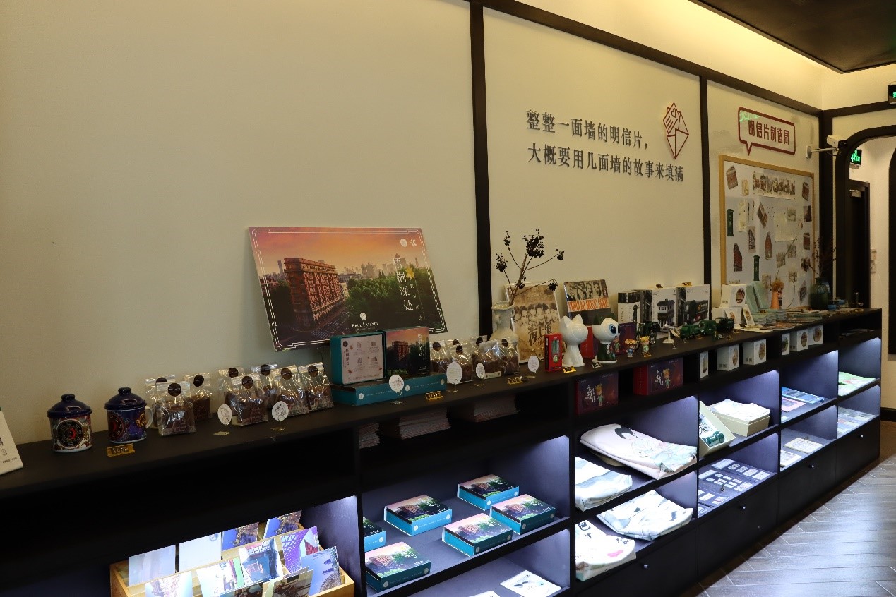 改造后的邮政所室内部分共53平米,新增加的文创区约占40平米。在售的文创产品大多以中国邮政和上海市建筑为主题,摆放在深色木制开放式柜台上。柜子顶层靠墙放有印着“梧桐深处——建筑可阅读”海报的小木板,海报前摆放的法式手工曲奇上,每一片都刻着一个上海市经典建筑。展柜的中间部分摆有中国邮政自主推出的墨绿色邮车模型和玩具盲盒,以及印有上海建筑的茶包礼盒,最下层是整套的纪念邮票。室内尽头的墙上则布置着“整整一面墙的明信片,大概要用几面墙的故事来填满”、“爱汇武康,言短情长”的标语,标语下方的柜子上放有多种武康大楼主题的胸针、记事本和明信片。