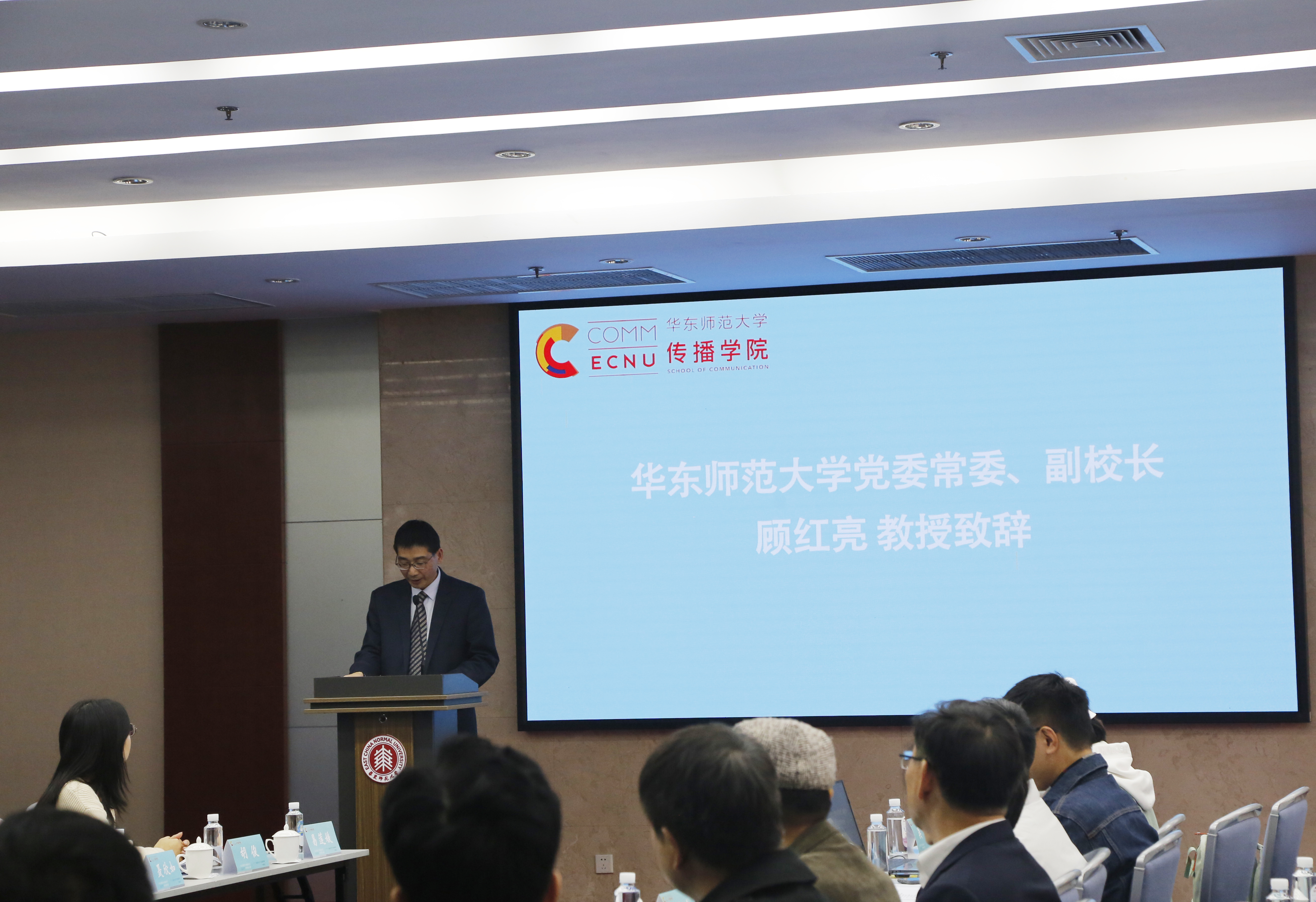 华东师范大学党委常委、副校长顾红亮教授发表致辞,对传播学院此次电影艺术实践给予了充分肯定,认为电影《热汤》是华东师范大学传播学院打通艺术创作与理论研究的壁垒,融化人文艺术与自然科学的坚冰,率先实践国家新文科教育理念的一次成功尝试。期待传播学院能以此为契机开展一系列跨学科跨媒介的深度合作,充分发挥高水平研究型大学在电影理论与评论方面的后发优势,弥补电影创作因各种客观条件限制而无法达到的面向与深度。并表达了对电影《热汤》公映顺利,传播学院蒸蒸日上的衷心祝福。