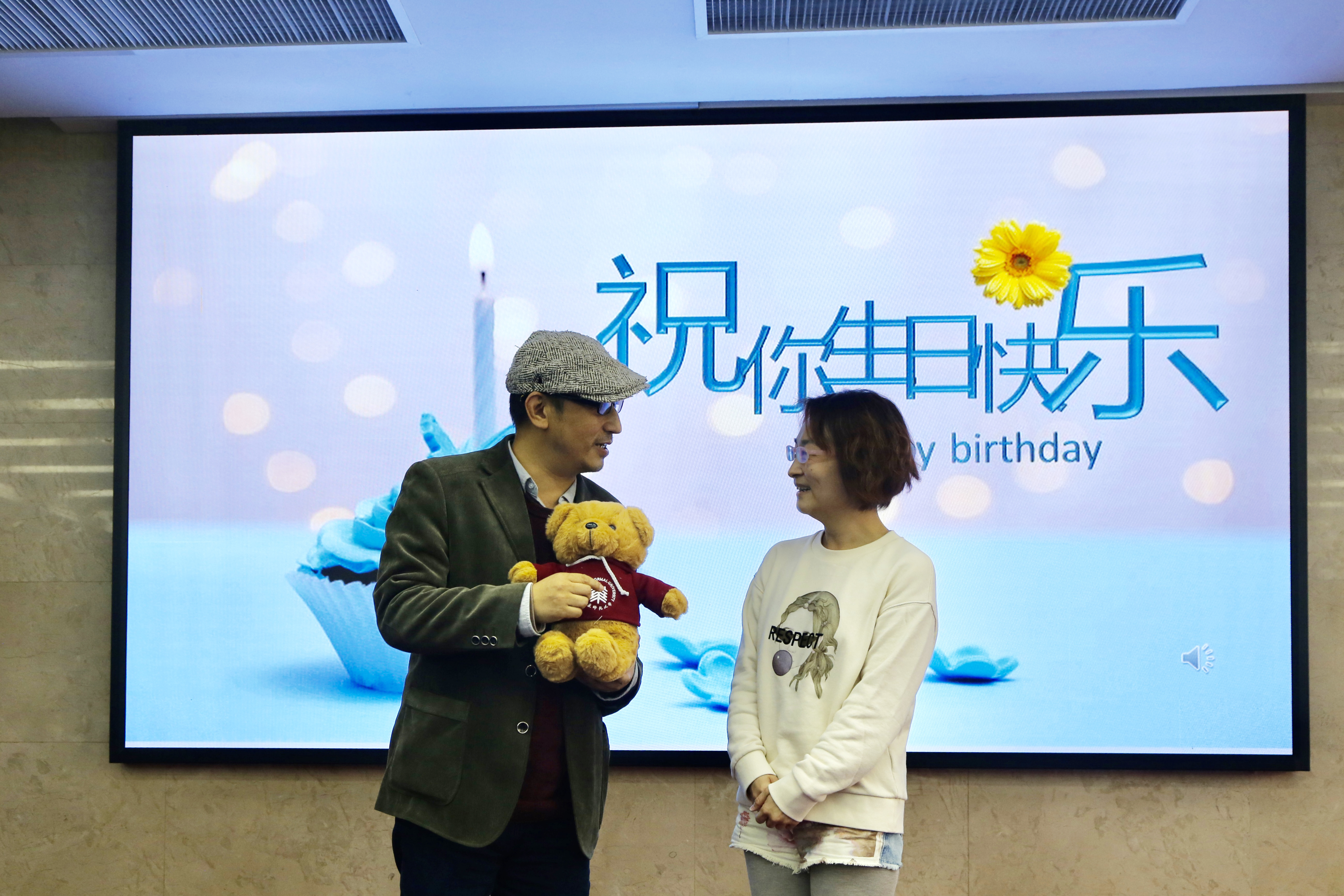 庄重的聘任仪式之后,是一个温馨时刻。活动当天是朱枫教授的生日,吴明为朱枫送上华东师范大学70周年的纪念版小熊玩偶,为他庆祝生日。朱老师在现场惊喜而又感动。