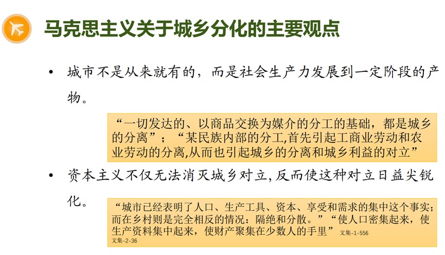 首先,江宇老师从马克思主义理论的维度出发,分析了“城乡分化”问题存在的动因。马克思认为,城市不是从来就有的,而是社会生产力发展到一定阶段的产物,是资本集聚的结果,所以资本主义不仅无法消灭城乡分化,反而会使这种分化加剧,进而产生对立。马克思主义认为,缩小城乡差距、消除城乡分化,是未来理想社会的一个重要特征,而要缩小城乡差距,必须逐渐变革资本主义生产方式,改变城乡分工,惟有实现这关键的两点,城乡差距才会缩小。由此,他认为只有以马克思主义为指导,并在社会主义制度之下推动乡村发展,才有可能真正解决“城乡分化”的问题。