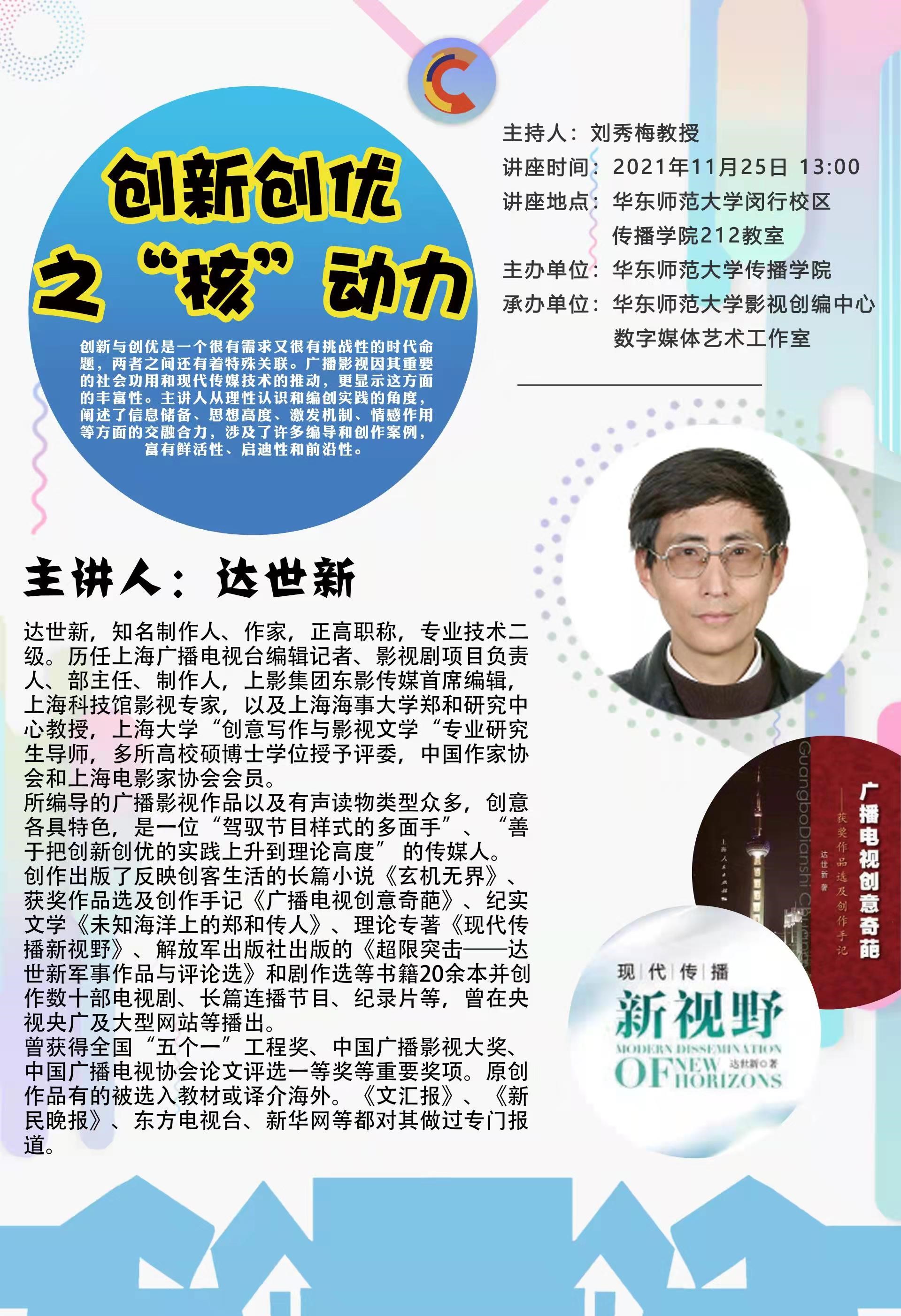 达世新,知名制作人、作家。历任上海广播电视台编辑记者、影视剧项目负责人、部主任、制作人,上影集团东影传媒首席编辑,上海科技馆影视专家,以及上海海事大学郑和研究中心教授,上海大学“创意写作与影视文学”专业研究生导师,多所高校硕博士学位授予评委,中国作家协会和上海电影家协会会员。