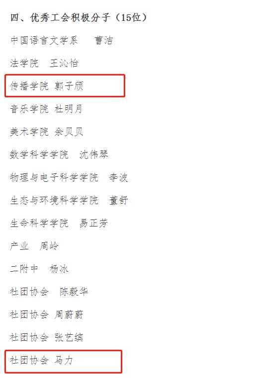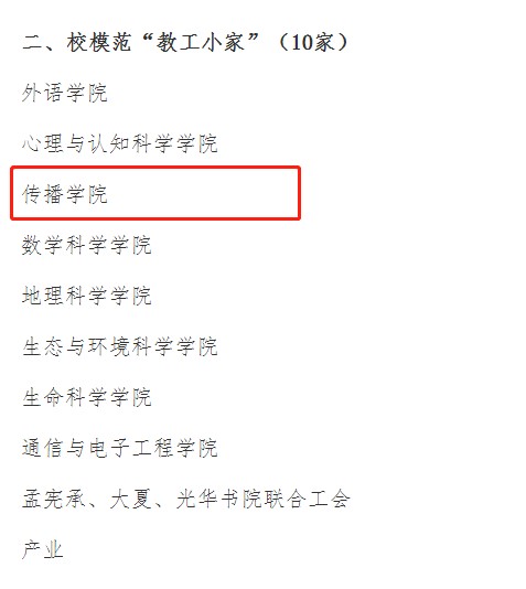 近日,校工会公布了2021年校工会先进评选拟表彰名单。传播学院工会在全校40家单位中脱颖而出,获评校模范“教工小家”,马力、郭子颀两位教师获评校优秀工会积极分子。