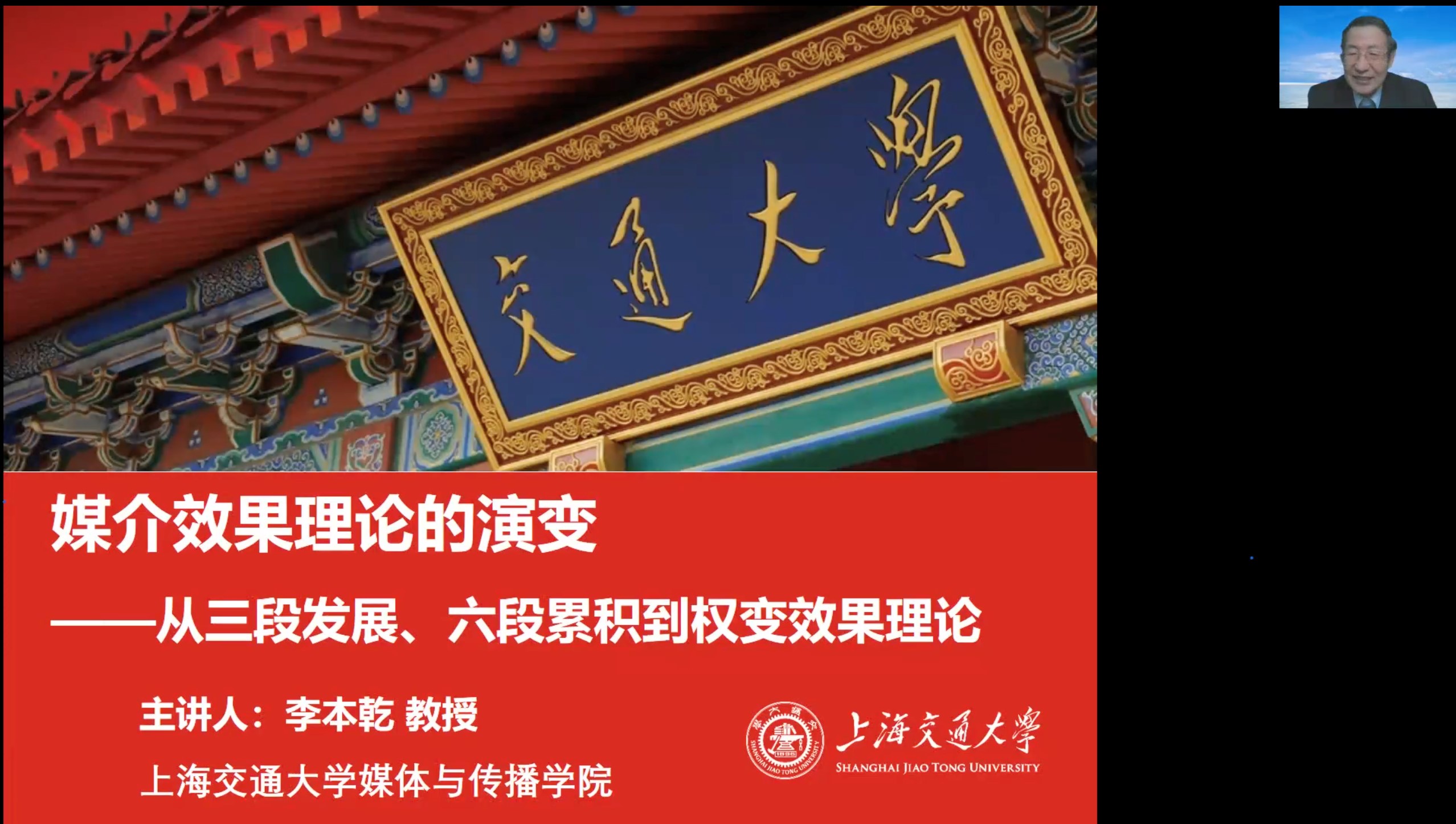 4月14日下午两点,华东师范大学人文社会科学“知名学者学术讲座”在腾讯会议平台举行。本场讲座由上海交通大学媒体与传播学院院长李本乾教授主讲,他以“媒介效果理论的演变——从三段发展、六段累积效果到权变效果理论“为主题,通过对不同阶段媒介效果理论的梳理与研判,为不断演化和变迁的传播格局、媒介生态和传媒环境提供了新的解读视角。传播学院副院长陈虹教授主持了本场讲座,三百余位听众在线参与。