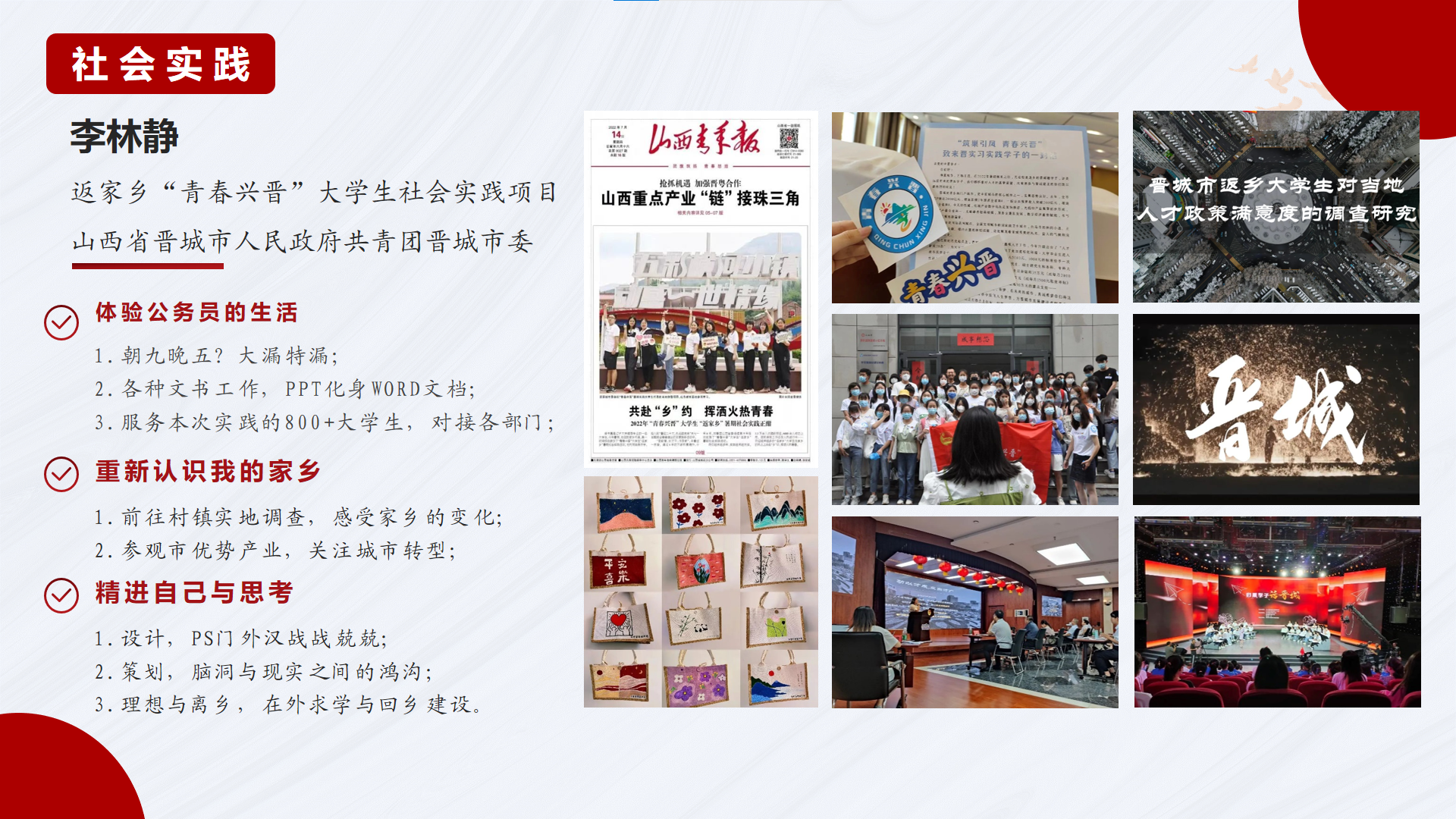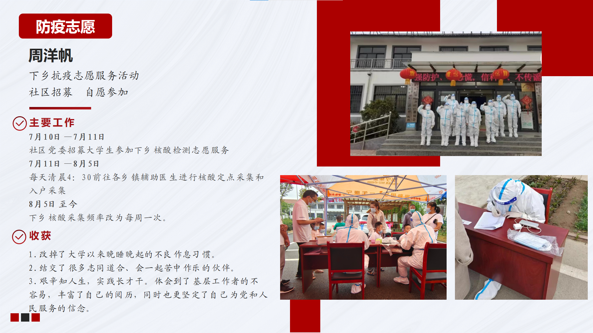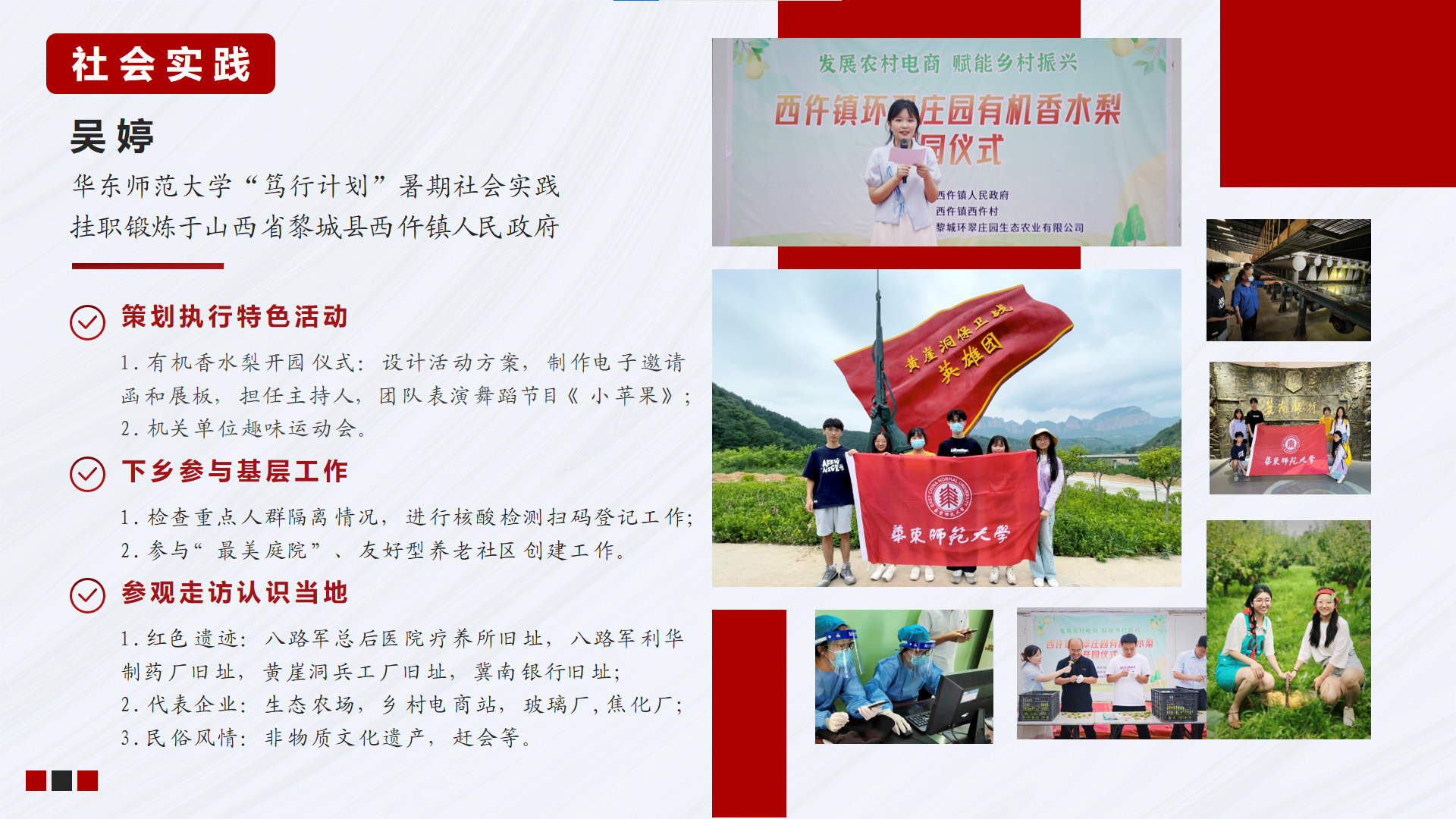 吴婷同志则参与了华东师范大学“阡陌笃行计划”暑期社会实践活动,前往山西省黎城县西仵镇人民政府进行三周挂职锻炼。她带领实践团队为当地特色农产品策划与执行开园仪式,以精彩纷呈的活动现场助力乡村振兴。此外,下乡服务基层,日常核酸检测,走访红色遗迹与代表企业亦是其丰富的工作内容。