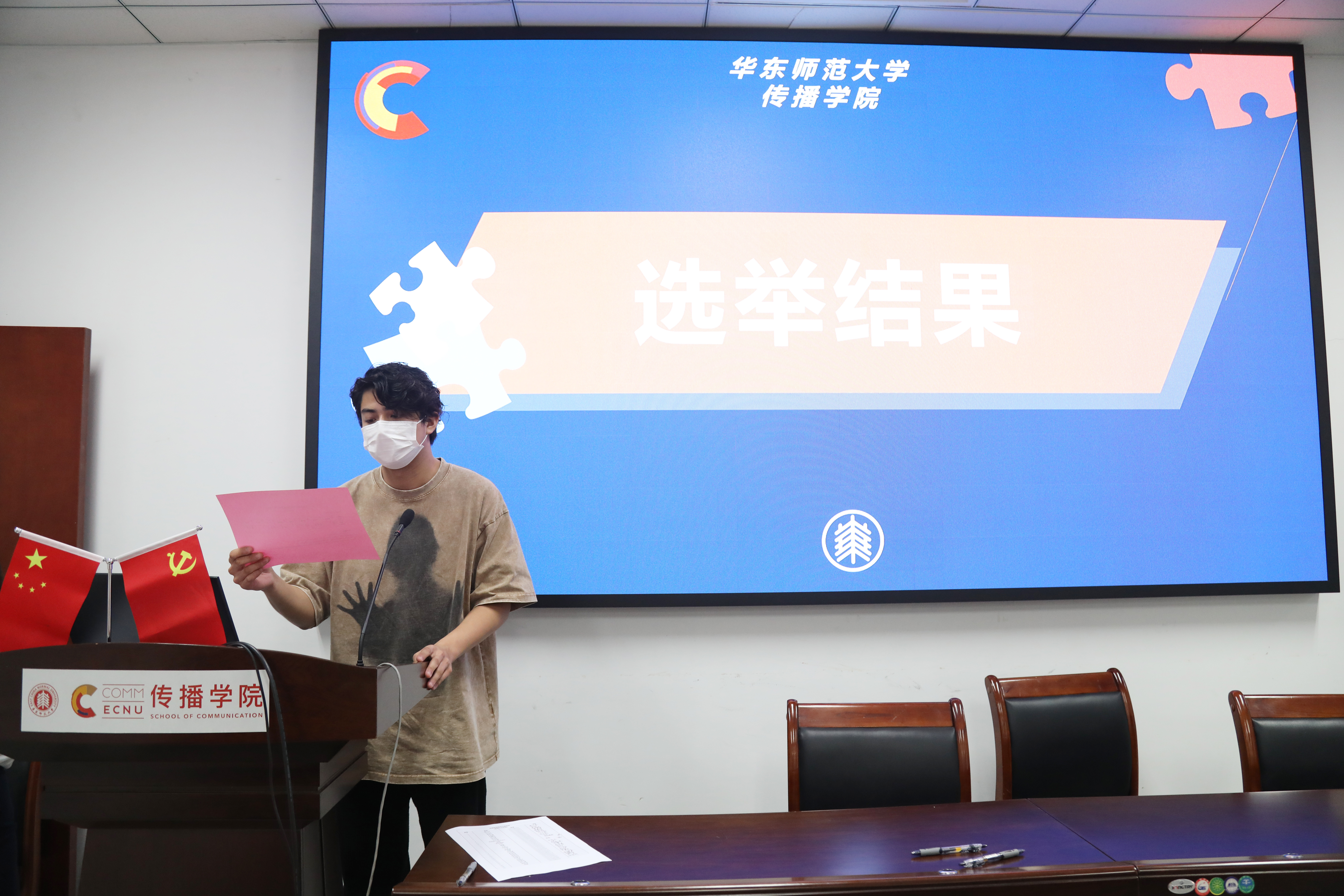 在与会代表和计票人、监票人的监督下,监票人石俣宣布传播学院学生会主席团选举结果,确保选举过程公开透明。选举结果为,吕思逸、张逸笑、杨沁怡三位同学当选新一届主席团成员。