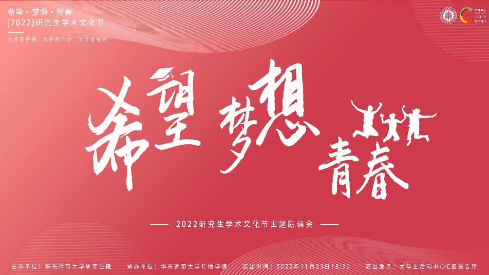11月23日晚,传播学院2022研究生学术文化节主题朗诵会在大学生活动中心C区报告厅举行。传播学院党委书记方奇华、副院长于晶,学院老师代表以及全校各学院师生代表、校友代表共同出席本次活动。在这里,学术之光、思想之光、文化之光交织辉映、热烈绽放,营造出浓郁的青春底色和学术节日氛围。