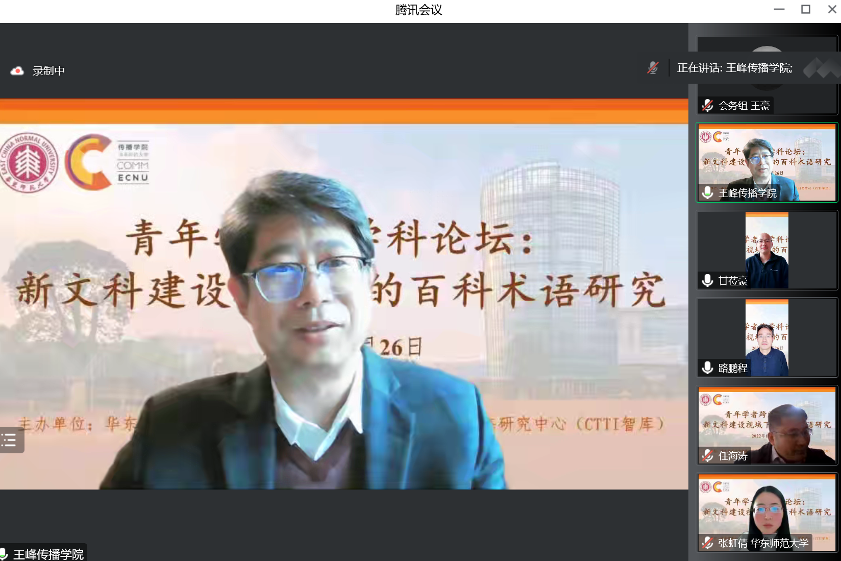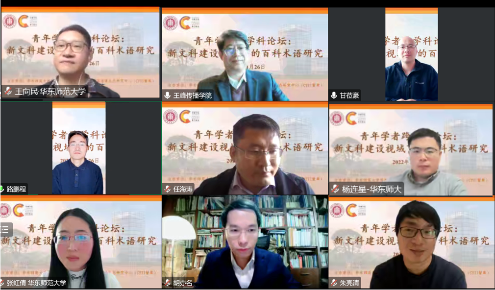 2022年11月26日,由华东师范大学人文与社会科学研究院、科技处、传播学院、国家话语语言生态研究中心(CTTI智库)共同主办的青年学者跨学科论坛第十一期,暨全国科技名词委科研项目《互联网百科平台中的术语传播机制及规范化研究》沙龙——“新文科建设视域下的百科术语研究”在线举行。