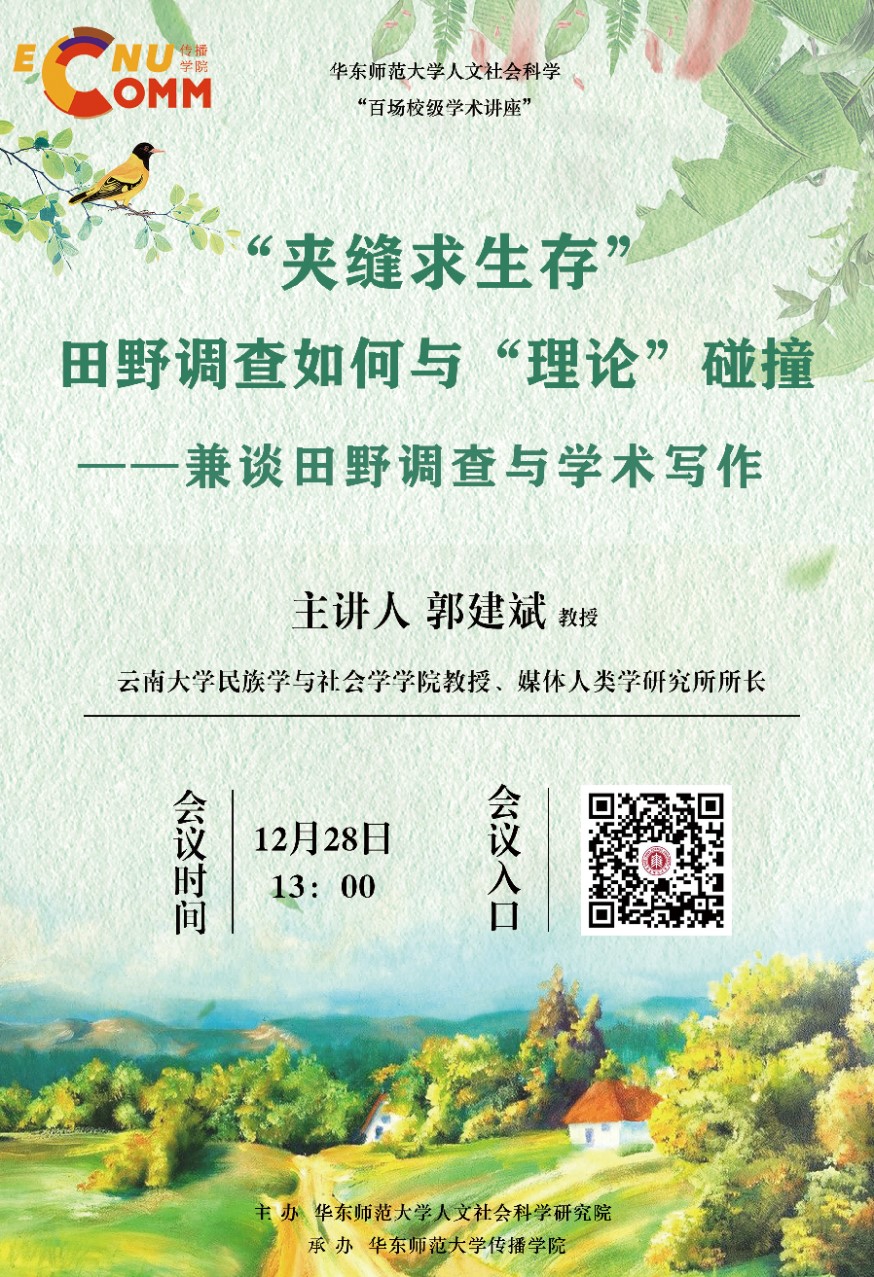 郭建斌教授将在本次讲座上对田野调查和学术写作方法等相关问题进行介绍和经验分享,并将结合自己二十余年来从事民族志传播研究的经验和相关论文,着重尝试回答一个困扰了很多从事田野调查和学术写作学者的大问题:如何“缝合”田野调查材料与理论?