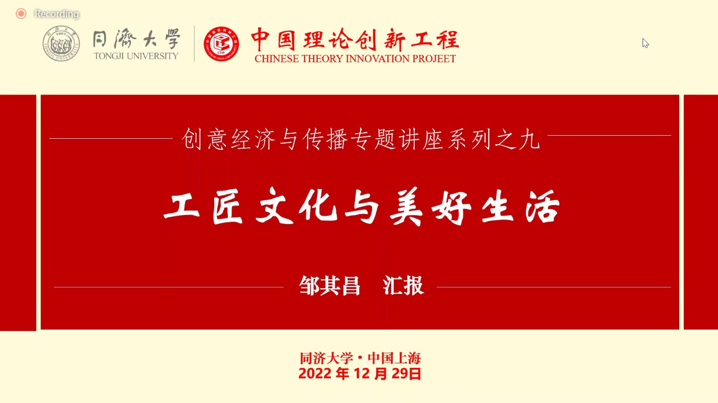 12月29日下午,2022年秋季学期“创意经济与传播讲座系列”的第九场讲座正式开讲,主讲人为同济大学设计创意学院和上海国际设计创新学院双聘教授邹其昌先生。本次讲座中,邹其昌先生从人力资本、社会资本等多方面展开,对工匠文化和设计学科的当下与未来进行了探讨并给出了可行的建议,同时对于自己多年来的设计学研究成果进行了综述,数十名学子在线上聆听。
