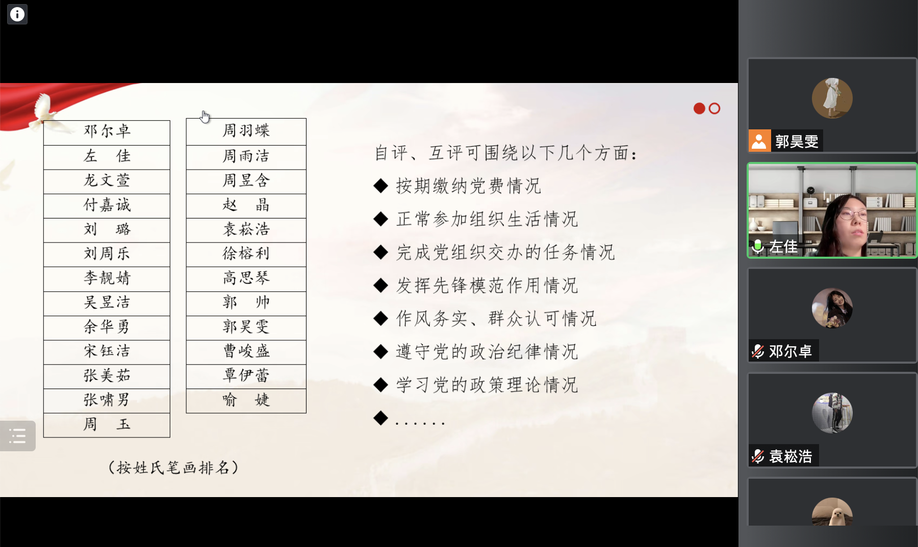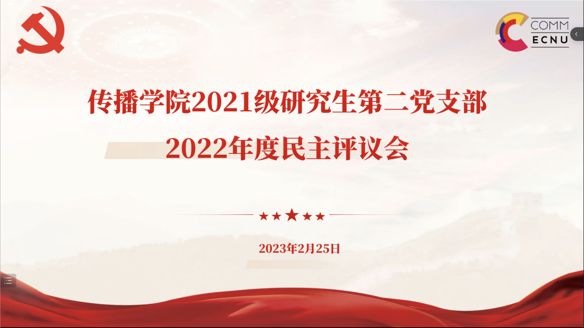 2023年2月25日,传播学院2021级研究生第二党支部开展2022年度组织生活会暨民主评议党员工作。会议内容包括学习《中国共产党章程》、支部书记工作述职、民主评议和民主测评四个环节,支部全体党员参会,会议由支部书记郭昊雯主持。