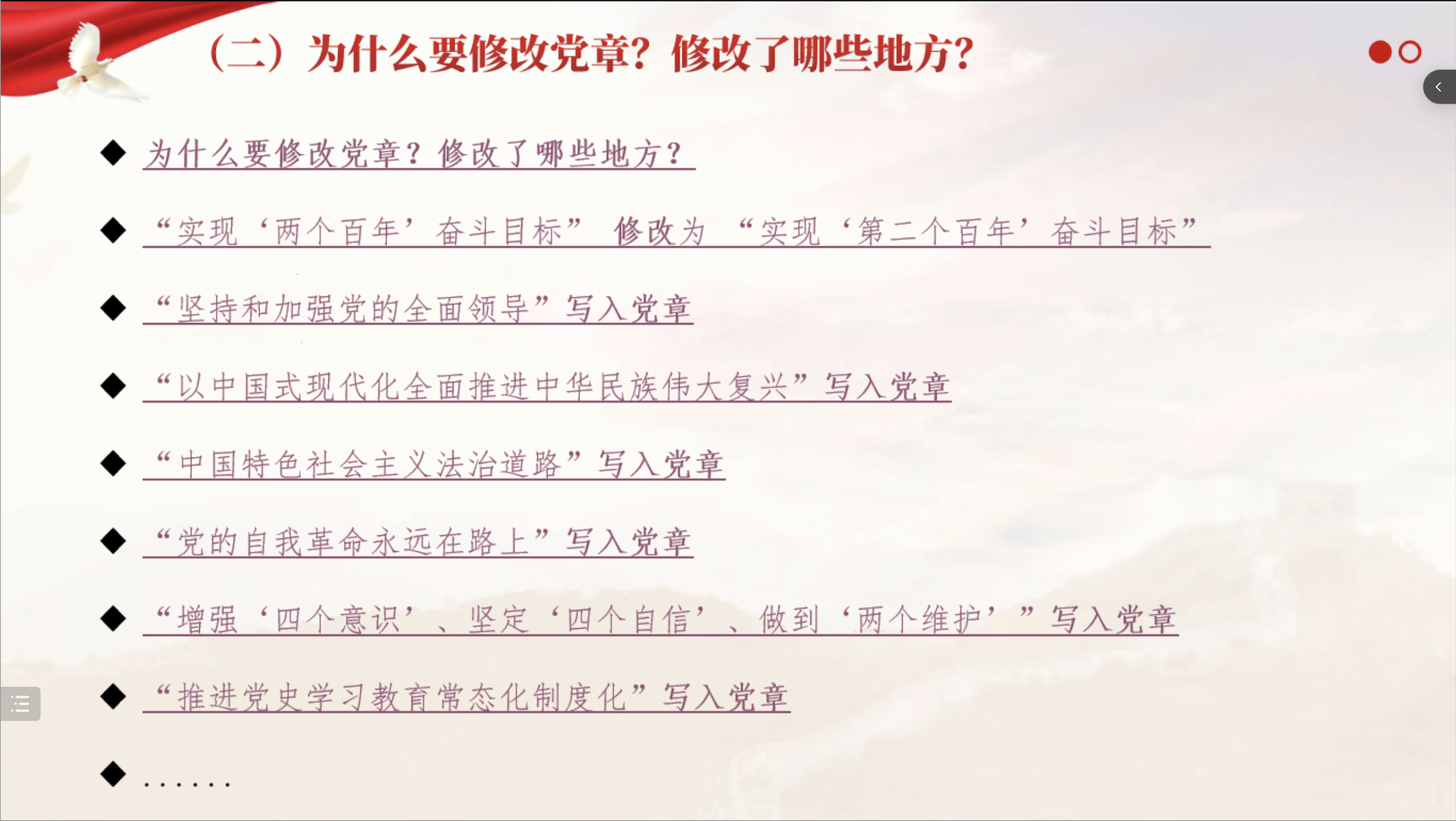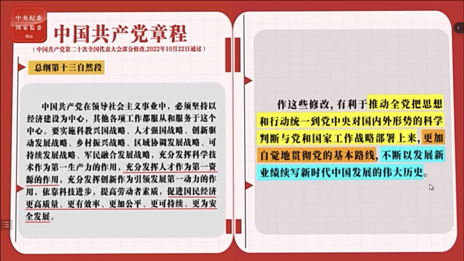 会议伊始,郭昊雯介绍了《中国共产党章程》修正案实施的背景、过程,带领全体党员观看视频资料,对新党章中修改的部分进行了对照学习,并梳理出修改要点以助党员们加深理解记忆。