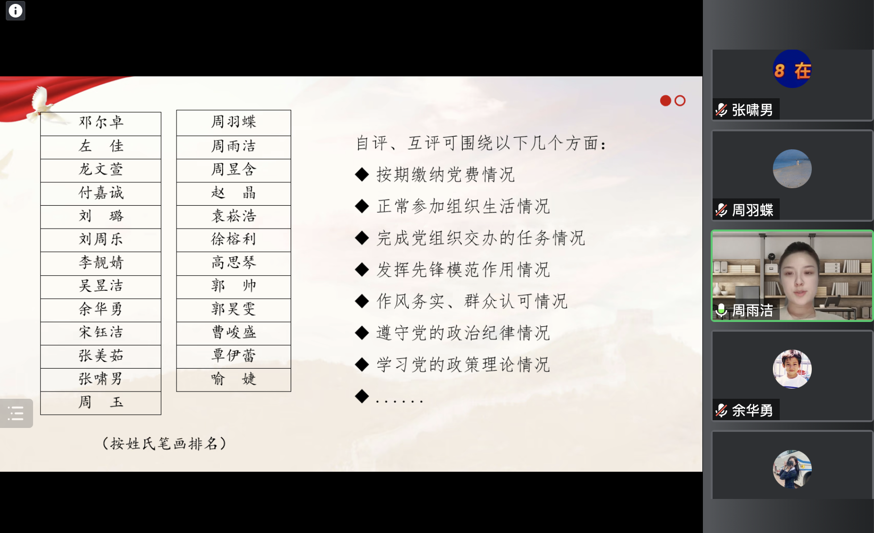 接着,25名党员逐一进行自我批评与互相批评。支部党员纷纷结合实际情况,对自己过去一学年中在思想、学习、工作情况上存在的进步与不足进行总结与反思,同时也对未来一年的规划进行了展望。同时,各位党员还作了坦诚的互相批评、互相交流意见,提出改进的具体建议。