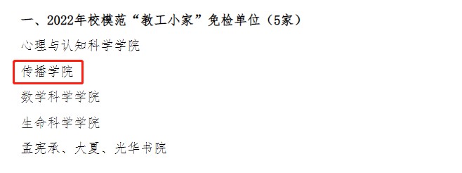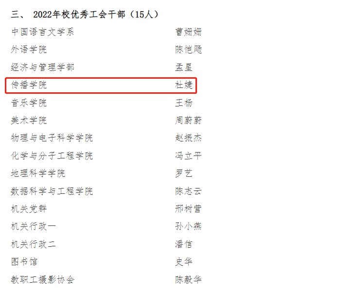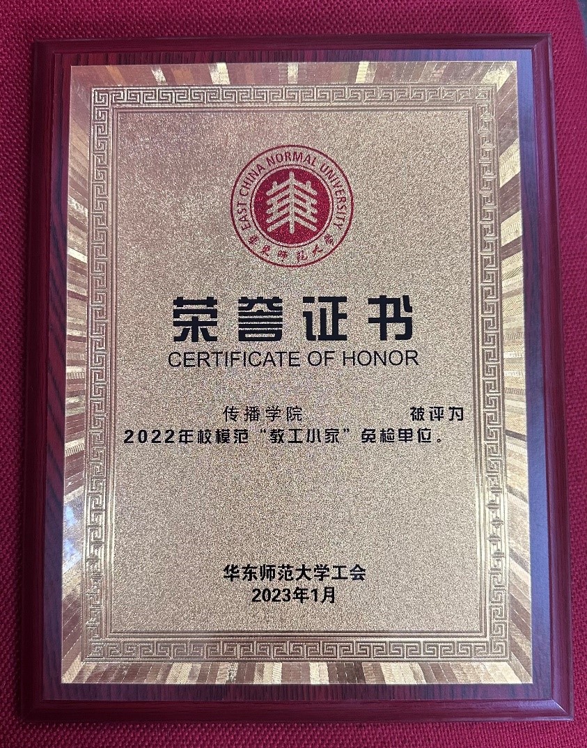 近日,校工会公布了2022年校工会先进评选拟表彰名单。传播学院工会在连续两年获评校模范“教工小家”的基础上,今年获评2022年度校模范“教工小家”免检单位”称号;学院工会 委员杜婕老师获评校优秀工会干部。
