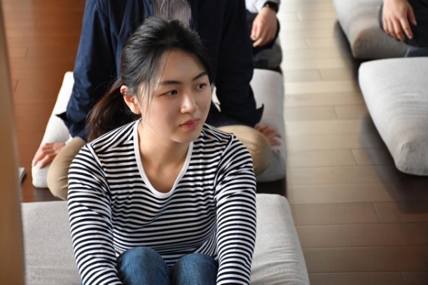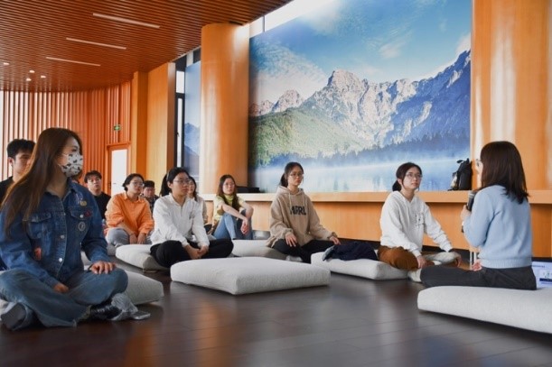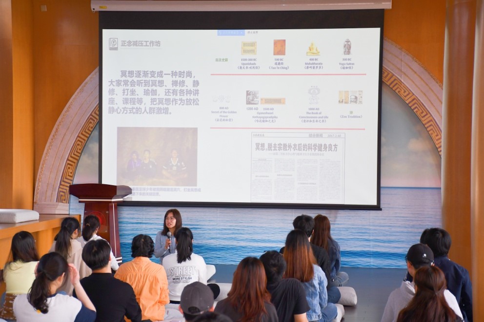 吴冉老师首先分享了自己的研究感悟以及他人的经历,向同学们介绍了正念冥想在减轻压力、减少负面情绪、提高学习工作效率等方面的突出效果。现场的同学们也分享了自己最近的状态和烦心事,表达了希望通过这次冥想来缓解焦虑的期待。