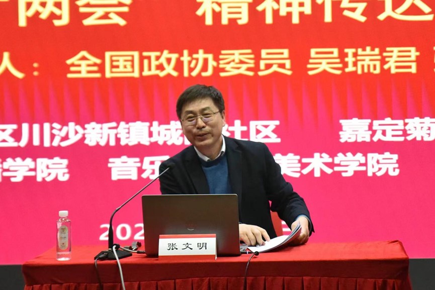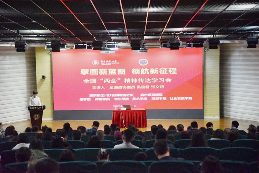 为深入学习贯彻习近平总书记在全国两会上的重要讲话精神和全国两会精神,进一步把思想和行动统一到党中央各项决策部署上来,3月22日下午,传播学院联合社会发展学院、法学院、音乐学院、美术学院、双创学院等在闵行校区学生之家C区报告厅学习传达全国两会精神。全国政协委员、校长助理、人口研究所教授吴瑞君和全国政协委员、国家教育宏观政策研究院副院长、社会学系教授张文明分享履职体会。社会发展学院党委书记熊琼主持会议。