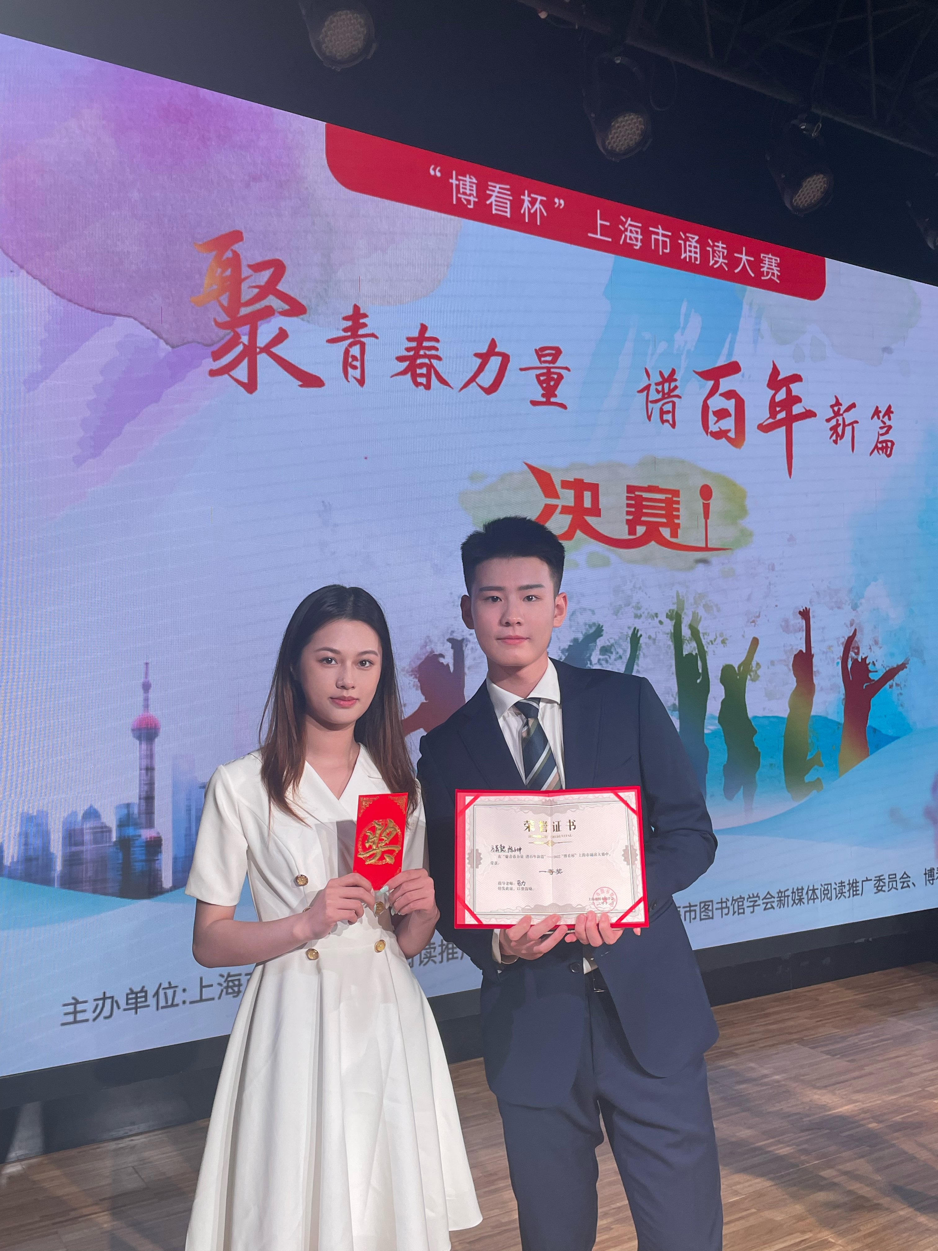 由上海市图书馆学会阅读推广委员会主办,上海市图书馆学会新媒体阅读推广委员会、博看网承办的“聚青春力量谱百年新篇——2023博看杯诵读大赛”决赛于5月16日下午在上海图书馆东馆举行,来自上海各区县和高校图书馆选送的24个优秀作品现场表演。经过激烈角逐,我院播音主持艺术专业21级学生陈子坤、方萧懿朗诵的作品《英雄》最终以97.17分的全场最高分荣获本次比赛一等奖,马力老师荣获“优秀指导教师奖”,华东师范大学荣获“优秀组织奖”。