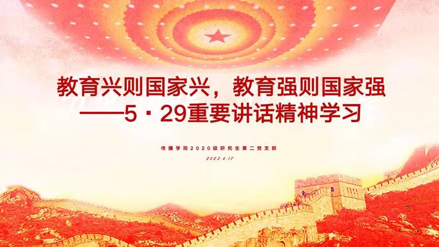 2023年6月17日下午,为深入贯彻5·29重要讲话精神,传播学院2020级硕士研究生第二党支部举行“教育兴则国家兴,教育强则国家强”主题党日活动,集体学习习近平总书记重要讲话,明晰中国特色社会主义教育发展道路。