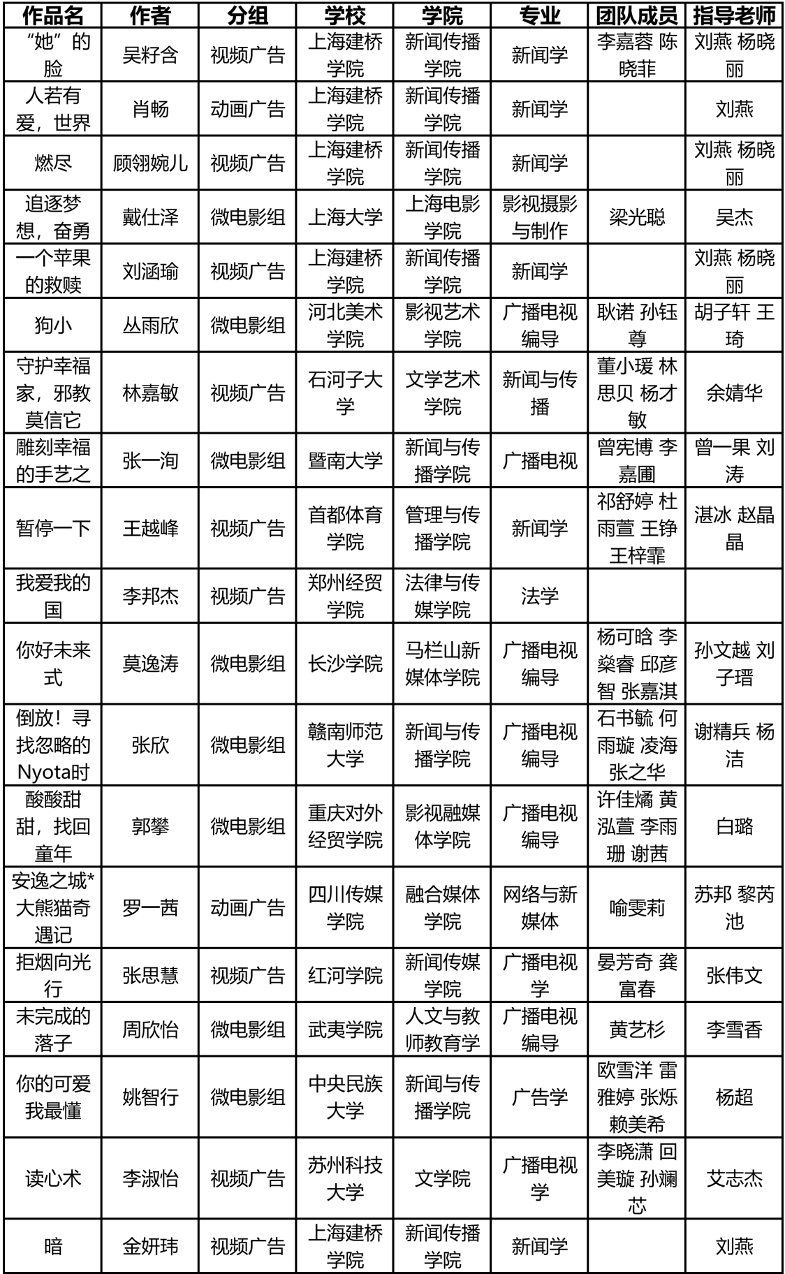 第十八届上海大学生电视节视频广告大赛以公益广告为命题,2025年7月25日至9月15日征集参赛作品,共征集来自全国47所高校报送的333件作品。经组委会慎重筛选,入围评审作品数量共197件。经过三轮评审,有3件作品获得一等奖、15件作品获得二等奖、30件作品获得三等奖、56件作品获得优秀奖。为保证评审的公平、公开、公正,现将评审团和获奖名单公布如下。